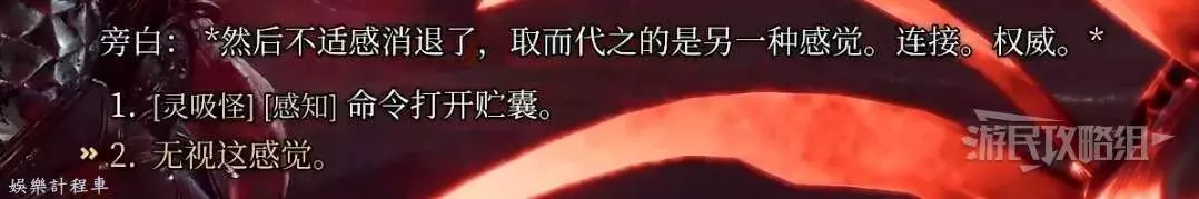 特定職業(野蠻人)與影心所在的貯囊互動時,選擇【力量(DC10)】選項會觸發基於角色力量屬性的檢定,嘗試強行打開貯囊,成功通過檢定就可以直接打開貯囊,無需與控制台互動。