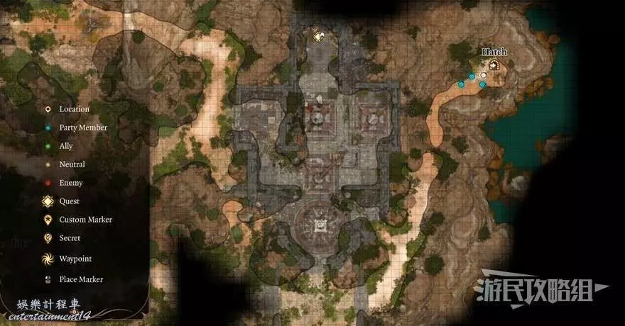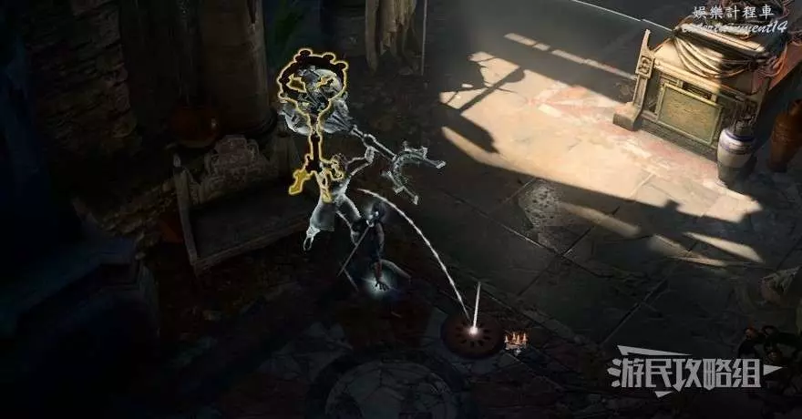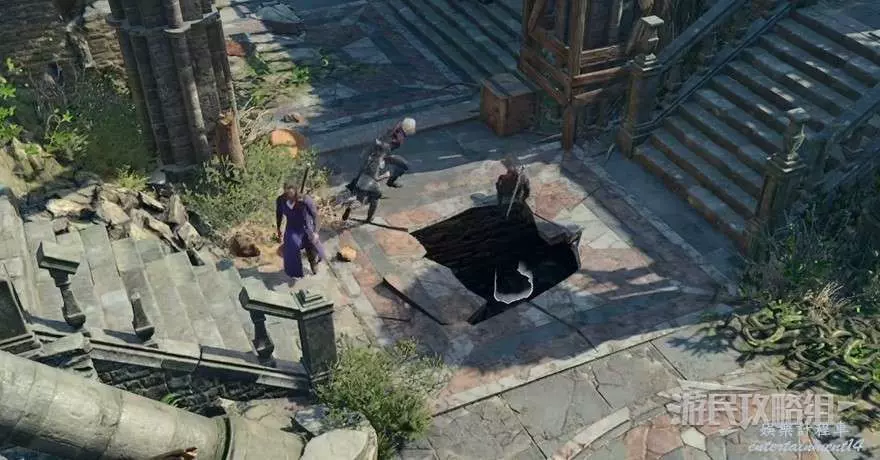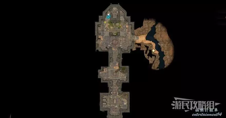 前往禮拜堂如下圖所示的位置用盜賊工具撬開活板門,進入陰暗墓穴的河流洞窟區域,在進入守墓人所在石棺的房間之前需要完成與骷髏的戰鬥。