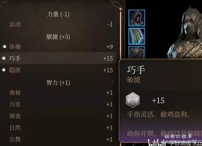這裡就很明確顯示了各種加成的來源:3+6+6 = 15 (巧手)