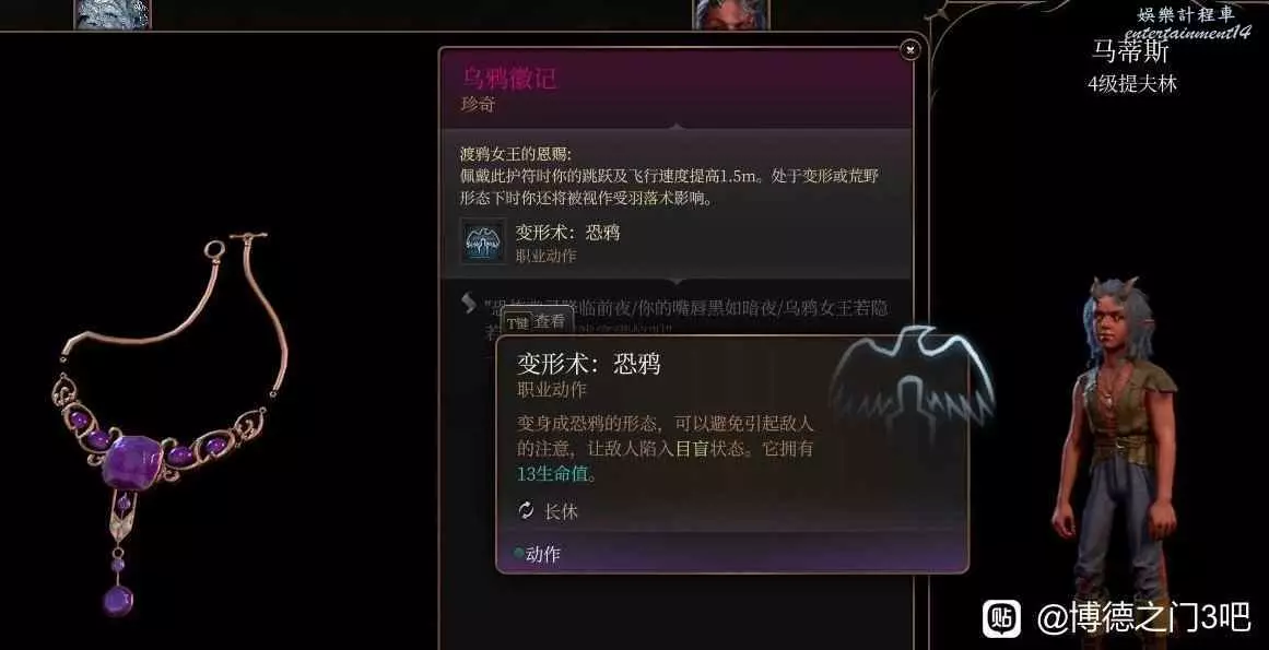 雖然是紫的……但效果還不如第一章的綠色戒指粉碎機之戒變形自帶羽落術也屁用沒有,裝備技能附帶的變身恐鴉更是垃圾中的垃圾還不如不變身變這玩意為什麼不變個豹子用潛行。