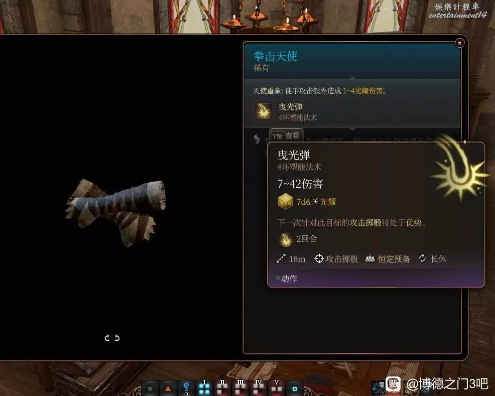 慈愛神殿內部有一排上鎖的箱子中最中間的箱子撬鎖偷取獲得,另外可以通過過調查撿定發現神父之死的線索,四環曵光彈傷害可觀還附帶造優,普攻+1d4光耀傷害應該還不錯的吧。