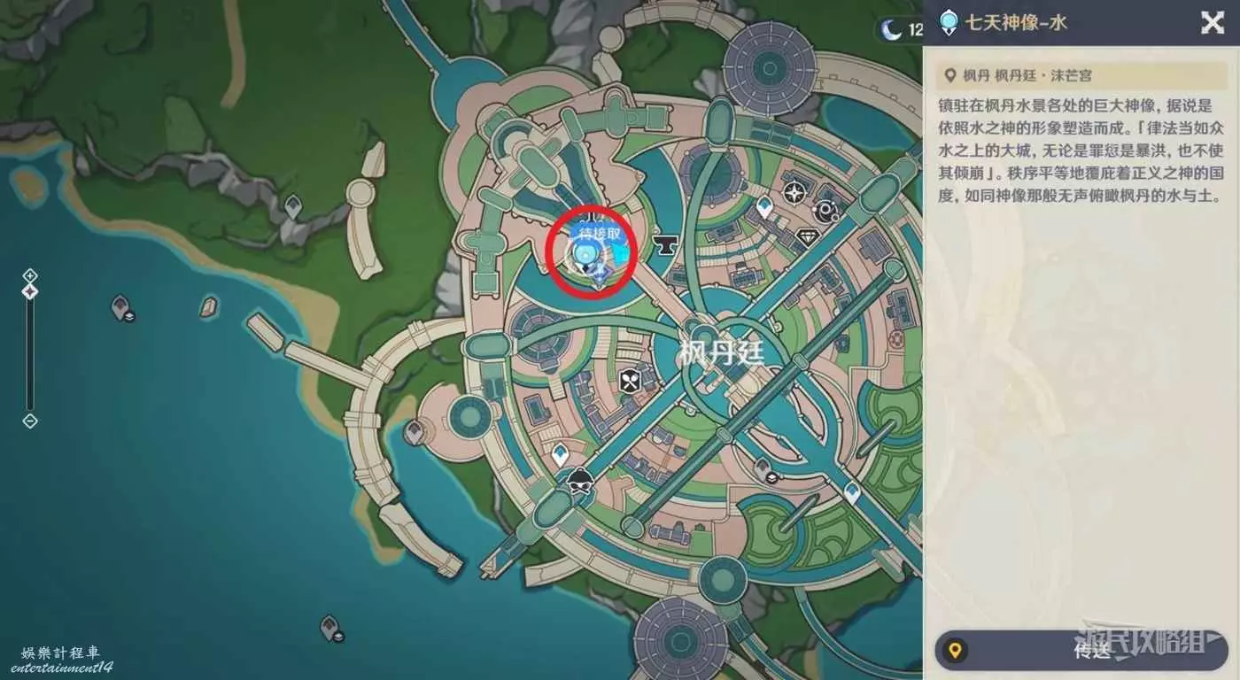 原神 (Genshin Impact) 楓丹廷七天神像解鎖方法 16 8 月 2023-08-16 廣告 作者:瑞破受氣包 來源:遊民星空 楓丹廷的七天神像地圖位置如下圖所示。 首先前往初次到達楓丹廷的噴泉廣場。進入噴泉後方的大門(楓丹廷水道樞紐)。 走兩側樓梯到達電梯。 乘坐電梯到達四層沫芒宮。 到達四層後,離開電梯間即可在對面看到七天神像。