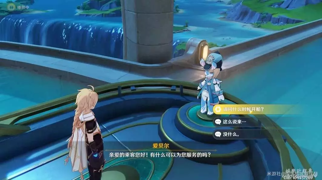 開啟完第一處神像後,往身後看,能看到一艘船,和船長對話就可以乘坐觀景船抵達楓丹主城了。