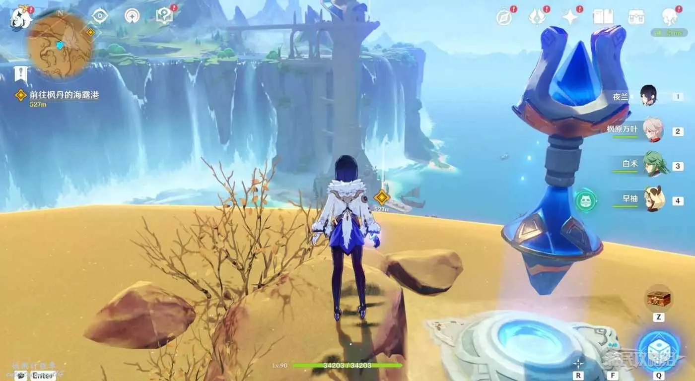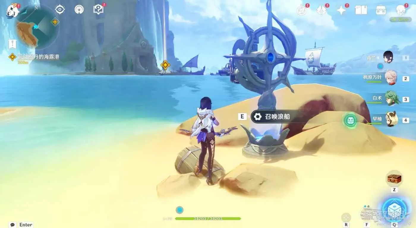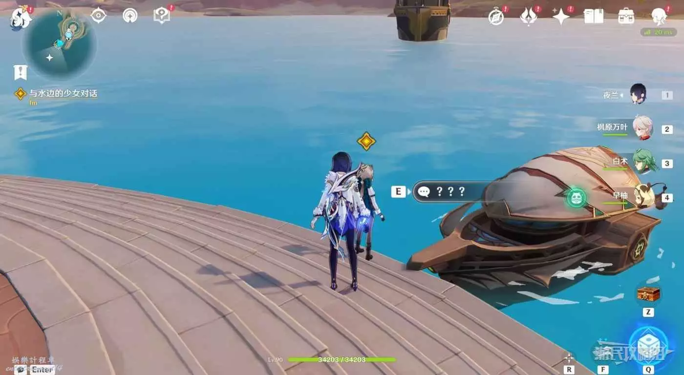 對話結束後會自動傳送到須彌與楓丹的邊境。到達邊境後跳下懸崖前往浪船錨點位置。
