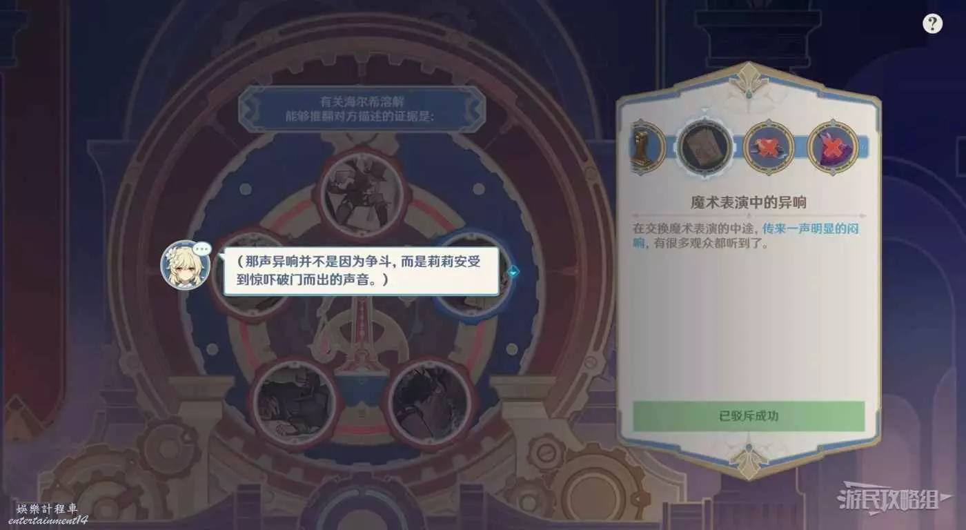 第二個環節【海爾希溶解】,選擇【魔術表演中的異響】駁斥。