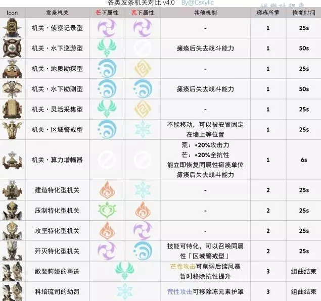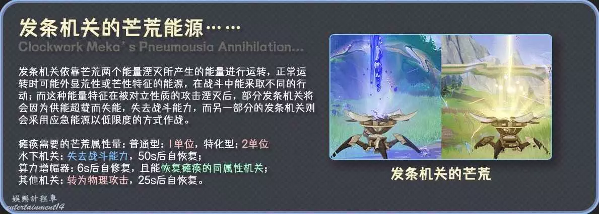 玩家可以通過觀察其發條處外顯的芒荒屬性,採用對立芒荒屬性的角色去進行攻擊,可使其超載癱瘓:例如琳妮特去癱瘓芒性的靈活採集型: