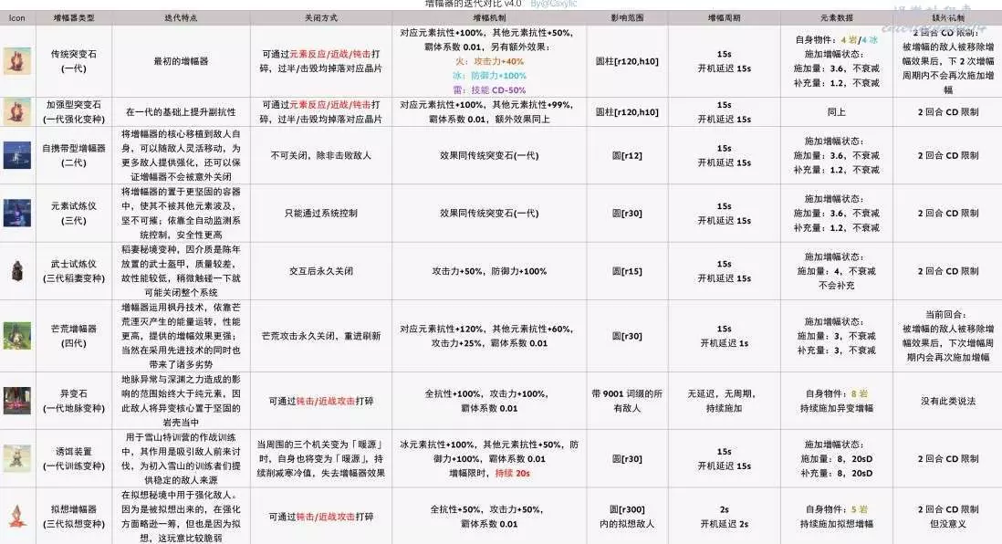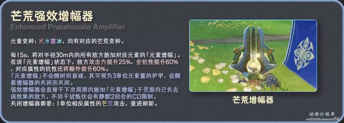 傳統增幅器:對應元素抗性+100%,其他抗性+50%,霸體,分元素還有其他特殊效果;