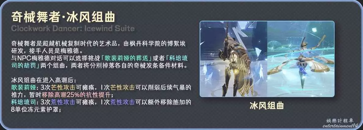 奇械舞者——冰風組曲(Icewind Suite)是楓丹科學院博絮埃研發的觀賞性發條機關,目前已被梅雅德接管。冰風組曲作為大世界BOSS,自然有著奇妙的機制: