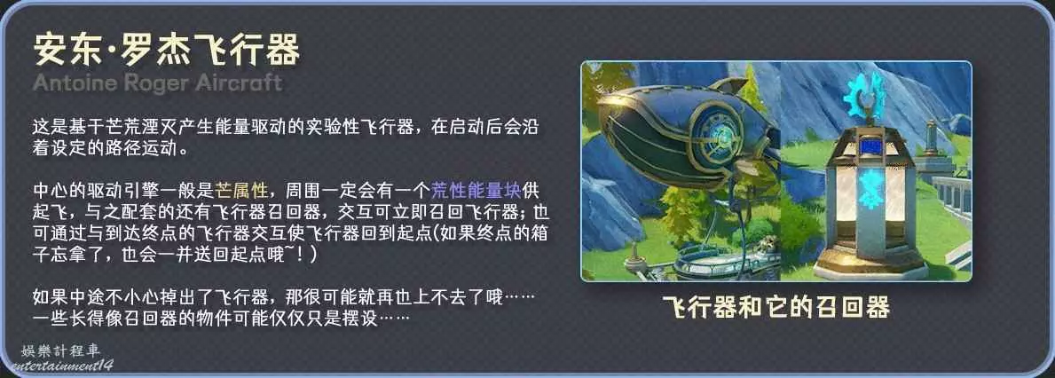 驅動飛行器的能源來自芒荒湮滅,啟動器外顯1單位芒性,周圍會有荒性能量塊,進行湮滅即可啟動飛行器。
