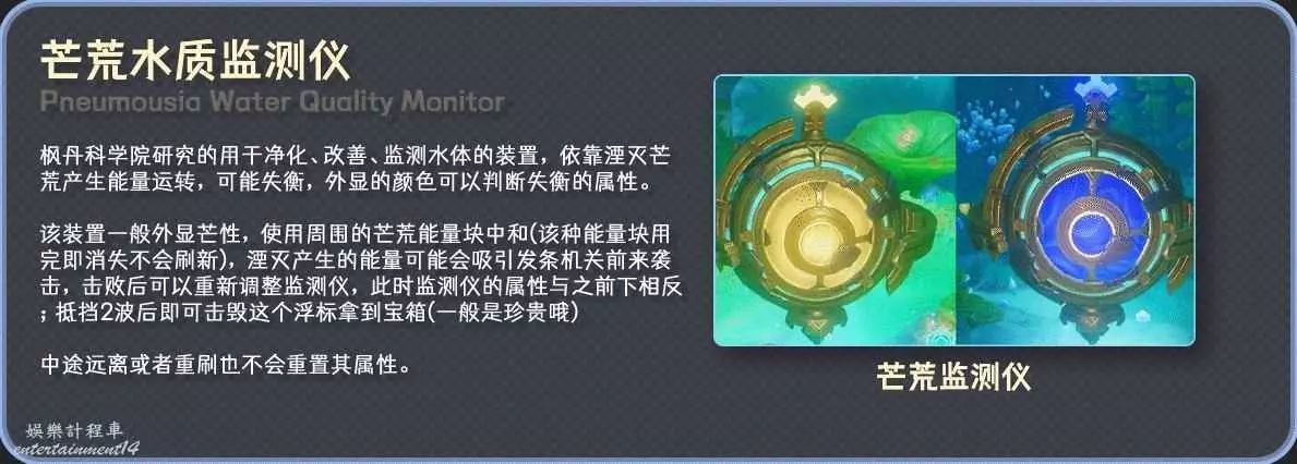 芒荒水質監測儀(Pneumousia Storage Box)由楓丹科學院研發,用於監測水下或者湖畔的水質,並且能夠改善區域水質,協調生態。