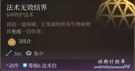 詳解:11級解鎖,需要專注/集中。全遊戲最強防禦技能,神也打不穿的防禦。免疫一切傷害,簡單且強大,可以配合擊退技能和冰牆等保證只有自己方吃到。只到SS的原因是所有生物包括敵人,需要擊退法術或者造牆類法術進行配合。