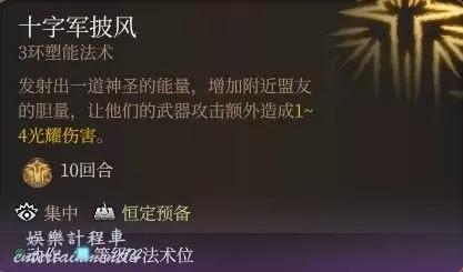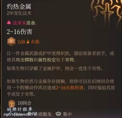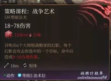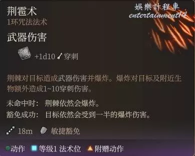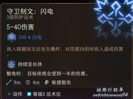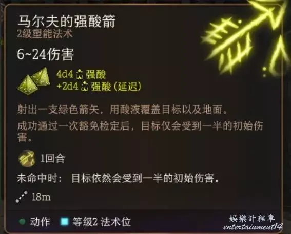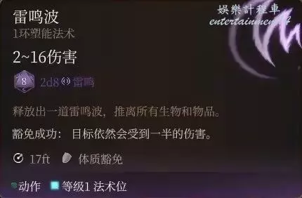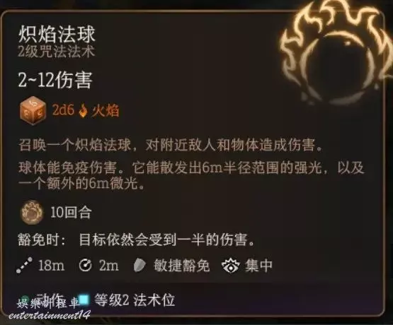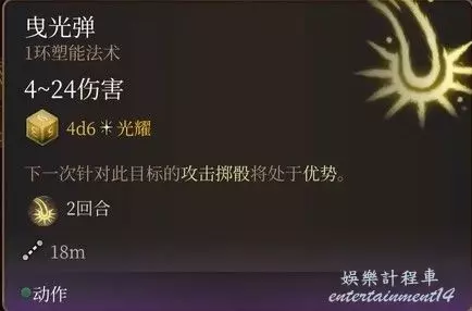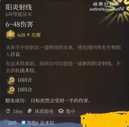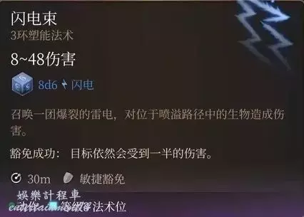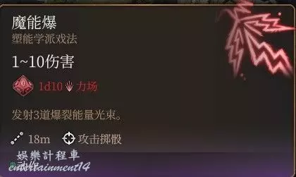 詳解:11級解鎖,無需專注但需敏捷豁免,力場輸出技能,幾乎沒有力場抗性怪,電火冰系遇到免疫時的高環輸出技能。9級便可得到卷軸,但被5環非常駐法術戰爭策略爆殺,因此評價為A。