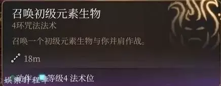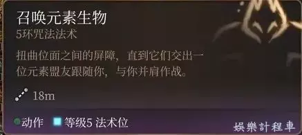 詳解:9級解鎖,戰前召喚術,法師最強召喚法術。召喚出來直到長休都可以一直陪同。法師續航的保證,4法無前排依然橫行博得的前提。強烈建議水元素,9級100血法師2倍,普攻上凍僵,配合潮濕可冰凍1回合,1技能2重擊,打凍僵2倍傷害,2技能錐形寒冰吐息,位移元素扭曲,無消耗傳送,有3種物理抗性,無視大部分地表效果。離譜中的離譜。其他元素生物只是屬性不同,還有不好配和元素反應,土元素更肉,風元素輸出更高。還可以卷軸召換,假如我1人1招閣下又該如何應對呢?