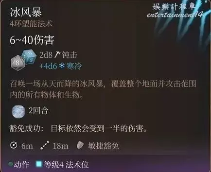 詳解:11級解鎖,需要專注,敏捷豁免,冰系輸出+控場技能,理論上輸出最高的冰系法術,唯一能看的冰系高環輸出技能,一招兩用,值得擁有。可惜需要專注拖累其評級。