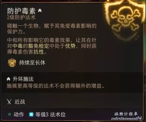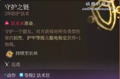 詳解:7級解鎖,需要集中,戰前使用,抗性防護法術,目前遊戲抗性不值錢,且被2環神術守護之鏈爆殺的法術。其存在讓人石化。
