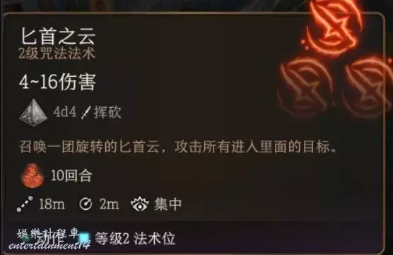 詳解:9級解鎖,需要專注且體質豁免,傷害很低但念在每回合可移動且有遮蔽效果,評級為B-。