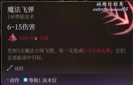 詳解:9級解鎖,不用專注不過豁免,6發力場傷害,每一發都能單獨觸發加傷等效果,魔法飛彈plus版,傷害高距離遠,太過強大因此限制每次短休用一次。目前只能3章卷軸獲得。上述2條影響了評級。