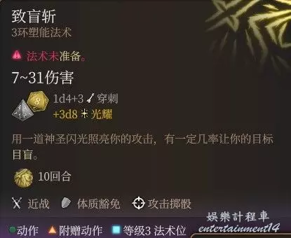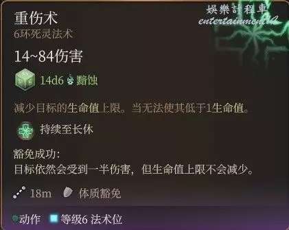 詳解:9級解鎖,體質豁免,需要專注,還不是常駐法術,需要特定子職解鎖,傷害很低還是穿刺傷害,屬實是沒點B數,評級為C–.