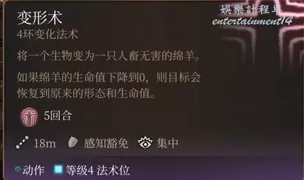 詳解:7級解鎖,需要集中,感知豁免,控制法術。只能變羊,打死綿陽別人還是滿血滿狀態,可以說有控制但跟沒有差不多。如果能變其他或者羊的血量跟原血鉤掛還有開發價值。其存在讓人變形。