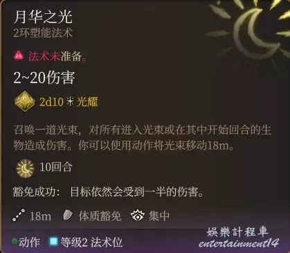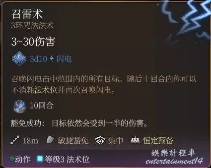 詳解:11級解鎖,需要專注,敏捷豁免,光系進階版招雷,配合雙動打出傷害,一次召喚終身使用,持久戰有效節省環位,屬於劃水技能,但用六環劃水是不是有點浪費呢。且傷害不穩每次偏低,故評級為A.