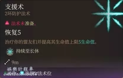 支援術很好用,我覺得他可以直接歸類在SS級技能,因為他是一次對全部人施放並非內文所說一次只能一人,且加生命值上限而不是臨時生命,效果還持續到長休而且召喚物同樣有效果,升環施法還加更多,配上6環的英雄盛宴簡直可怕