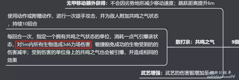 其他都是添頭,就共鳴之氣有點意思,增加了群攻能力。1回合只能1次,5m內3d6還吃豁免。一般,很一般。後期1拳估計有30傷害,這平均10的傷害太少了。花裡胡哨,不如多打2拳。基本沒啥必要。