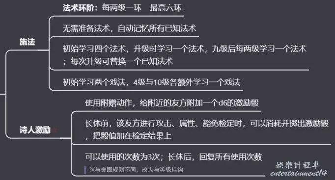 1.施法,2環升法。詩人竟然是個高貴的施法職業。9級後每2級才能學習1個法術,然後他的法表是偷的所有職業的,但又不是全部,這就導致走法系輸出起勢是不如術士、法師的。一般用來配合激勵打控制。