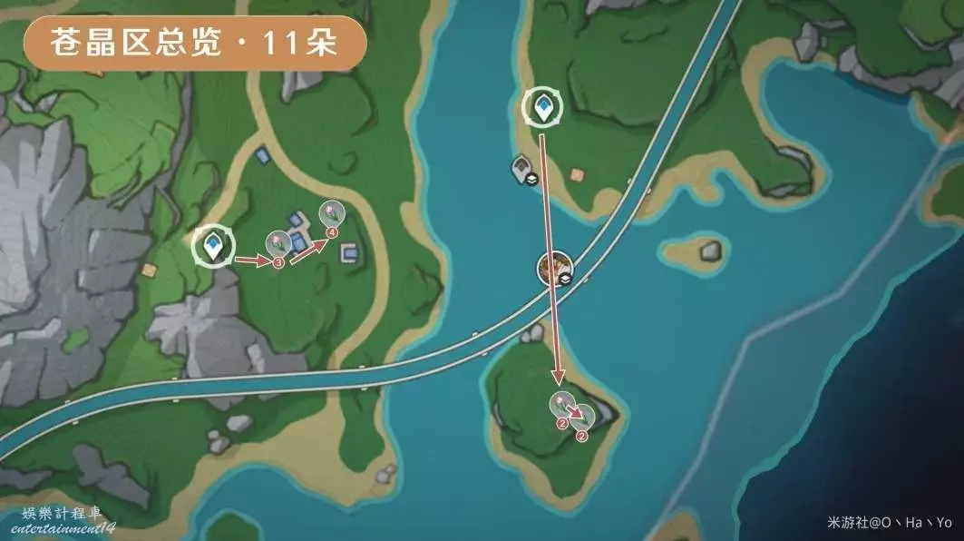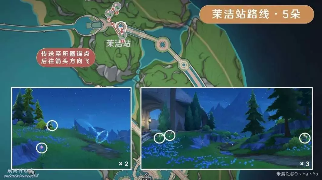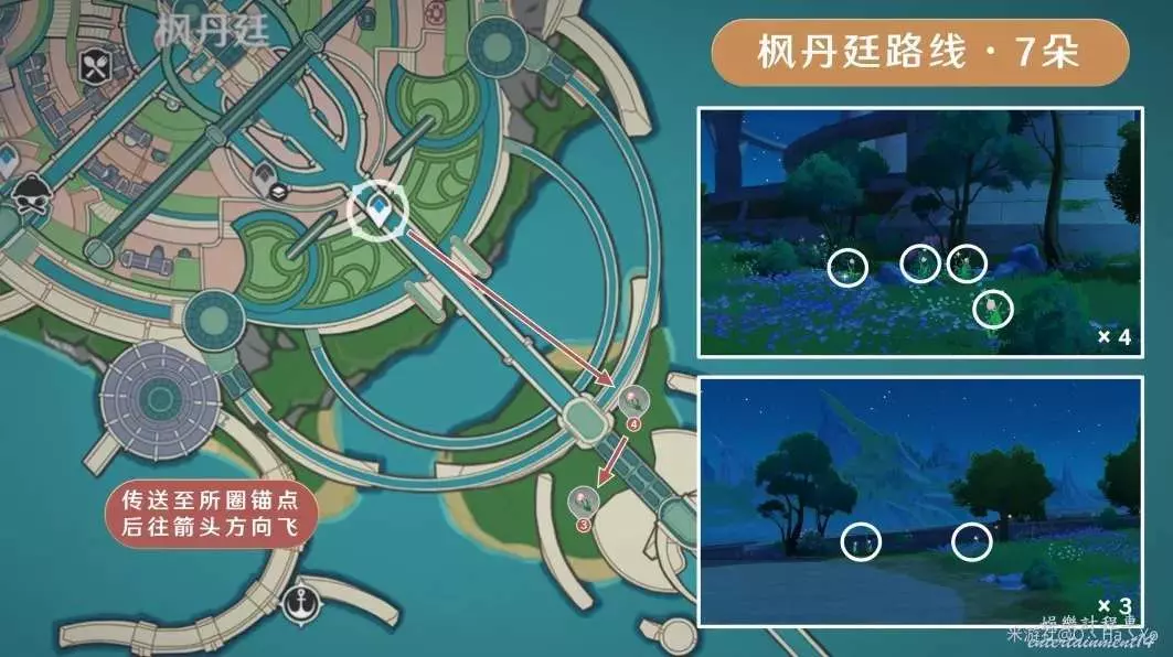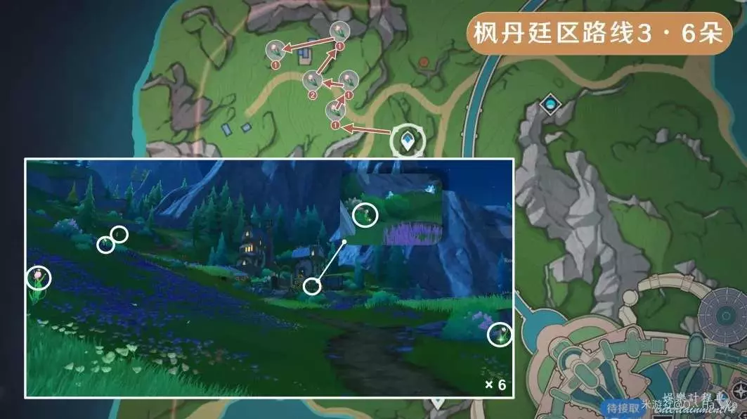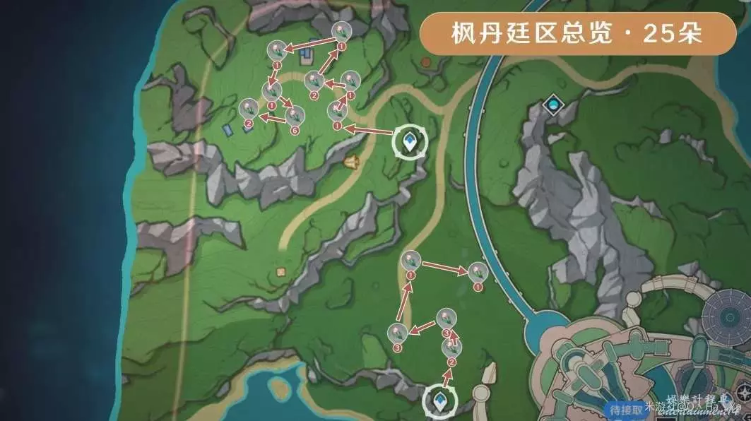 全圖找完,茉潔站路線5朵+露景泉路線9朵+楓丹廷路線7朵+楓丹廷區路線25朵+厄裡那斯路線11朵+蒼晶區路線11朵+秋分山西側路線5朵=73朵。