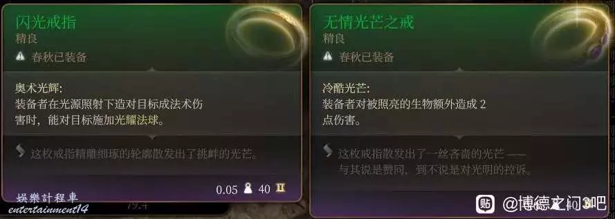 然後法師本人,兩個戒指位置我一直沒找到合適的戒指,第二個戒指位置我直接更換了閃光戒指。法師在光源下造成法術傷害給敵人上光。然後戲法學一個亮光術,每次長休完給自己上一個,必定觸發兩個戒指。