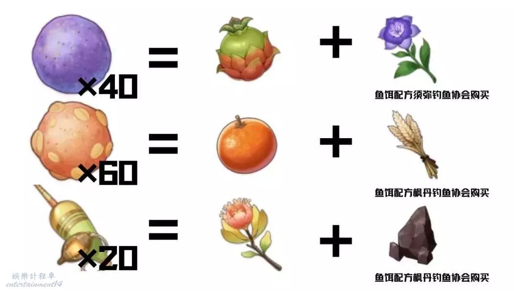 魚餌在煉金台製作,一次製作會出產十個魚餌!千萬別一股腦合多了,獲取滿精「灰河渡手」大概需要40甘露餌+60酸橘餌+20維護機關頻閃誘餌(需要稍微多合一點,因為有幾率釣到觀賞魚,會躍出水面的就是觀賞魚)兌換的配方需要背包使用後才可以在煉金台合成,配方在釣魚協會處兌換。