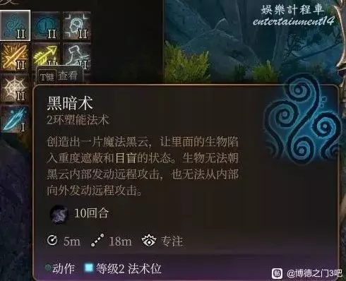 戰鬥中效果一般但戰鬥外可以通過這個法術來遮蔽視野偷東西,戰鬥內的用法就是黑暗術+aoe/限制法術把敵人困在裡面,最簡單的就是隊友卷軸黑暗術然後法爺冰風暴(冰刃術)或者油膩術,說是不能對裡面發動遠端攻擊但不指定目標的aoe不受影響。