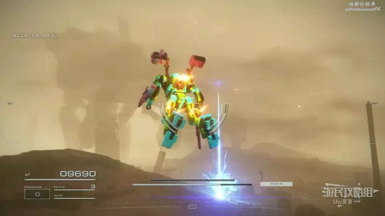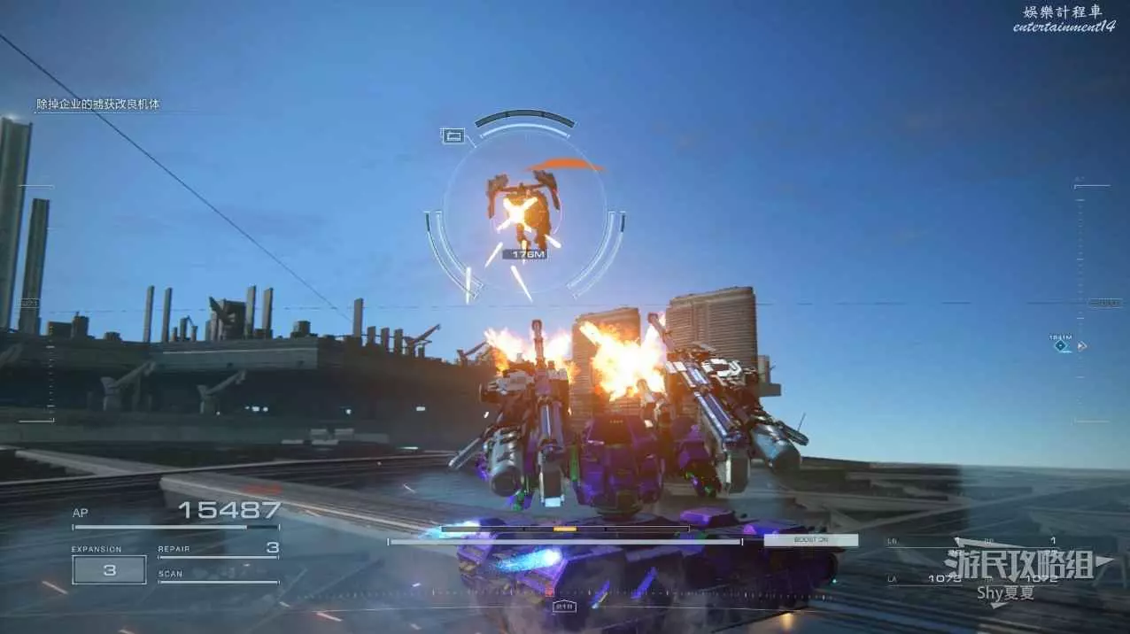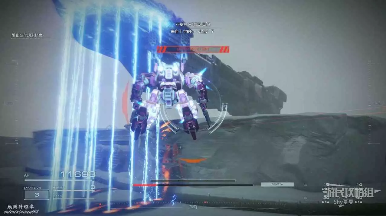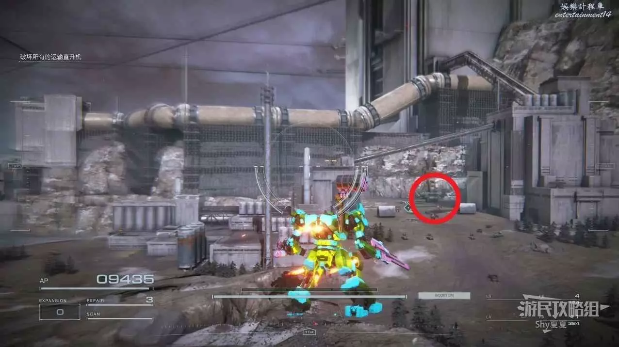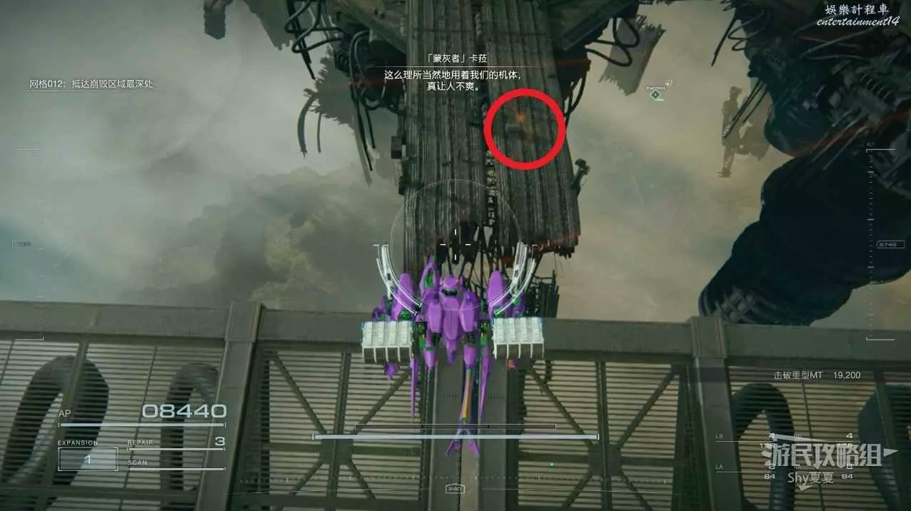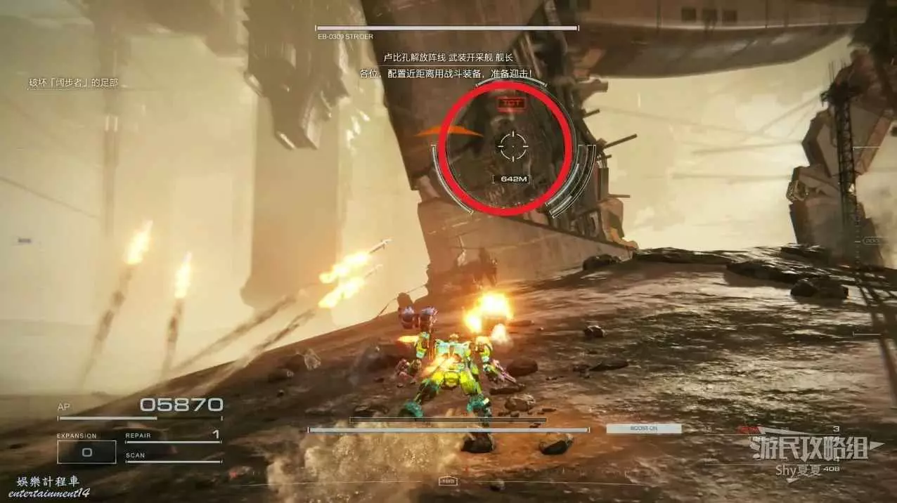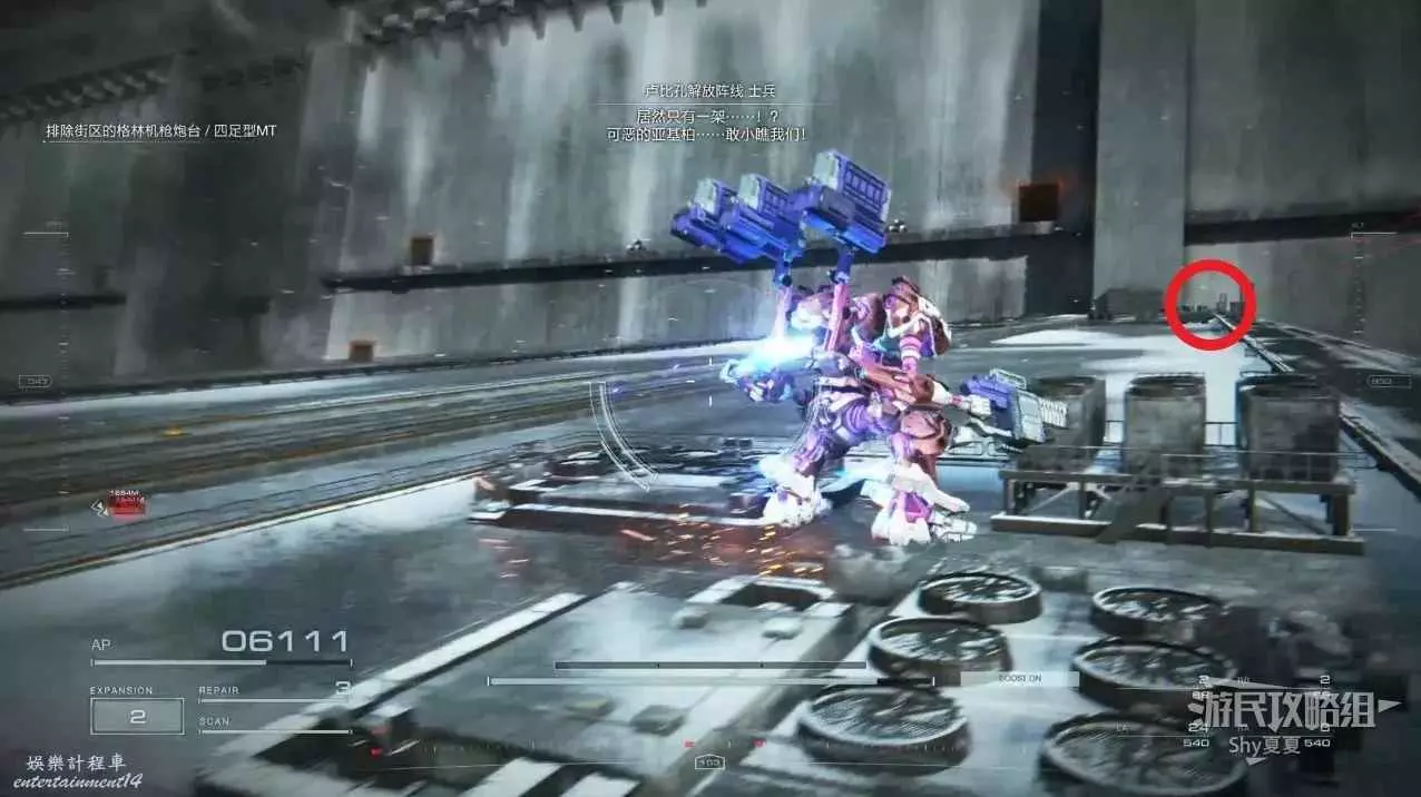 本關有持有護盾的敵人,可以近戰武器破防,可繞後攻擊,可用導彈轟炸,但是最好用的還是飛到他的頭頂直接攻擊。