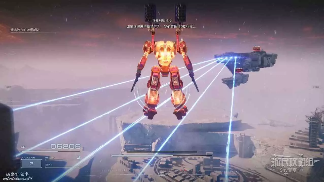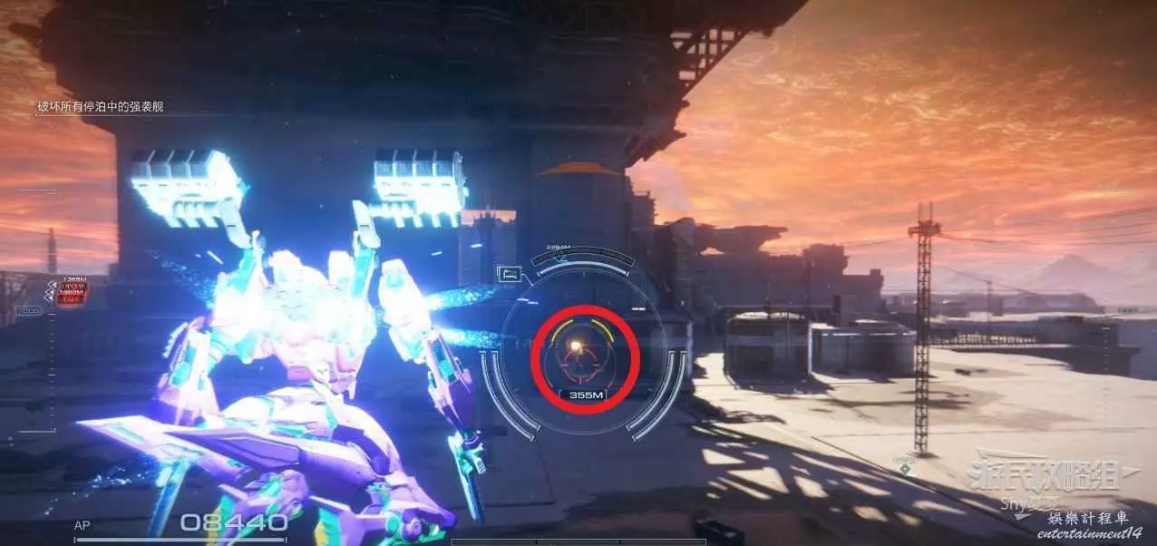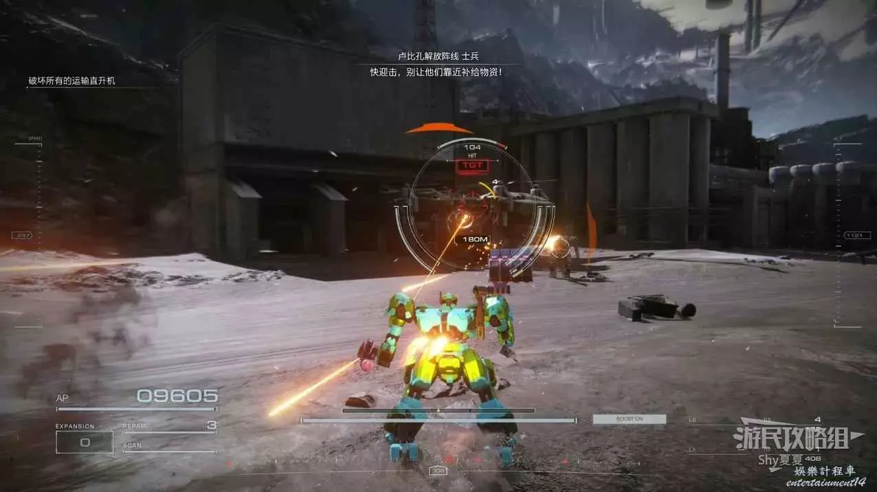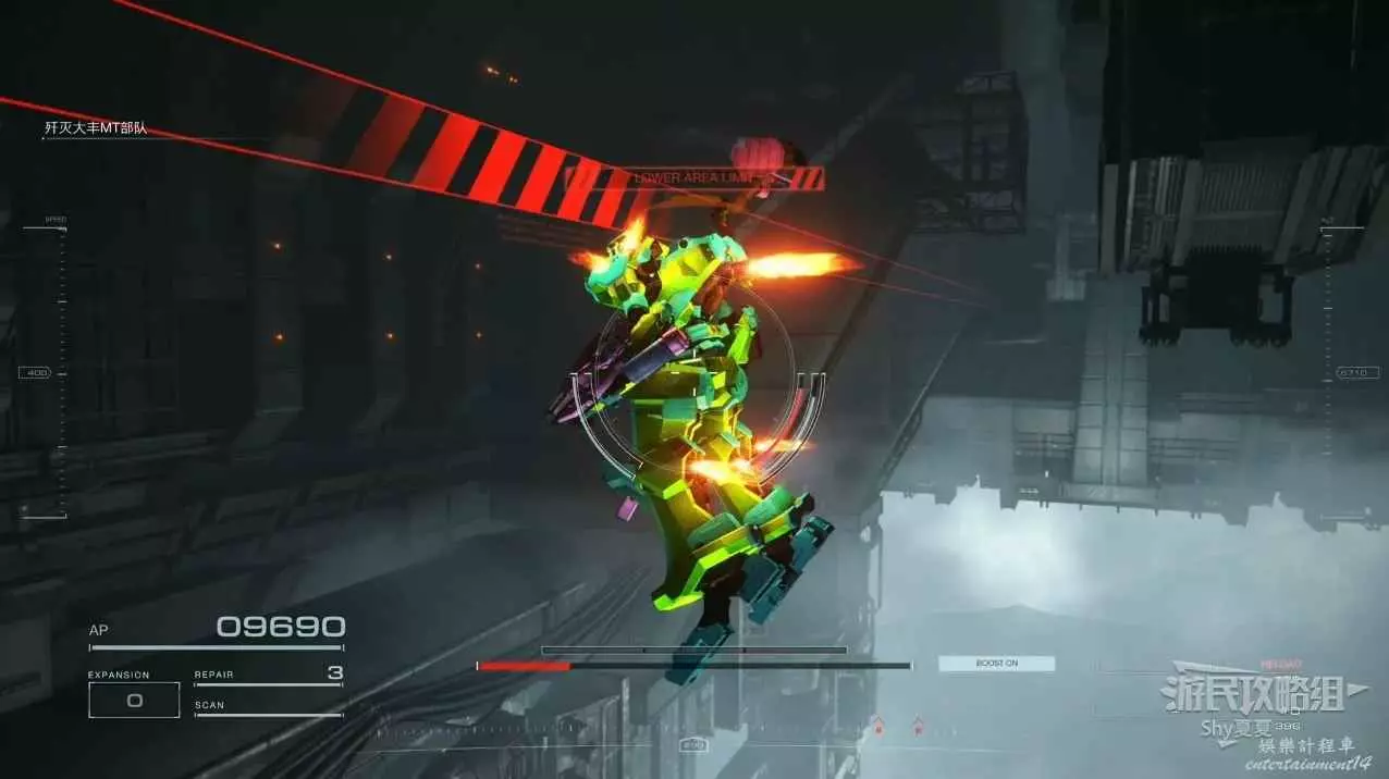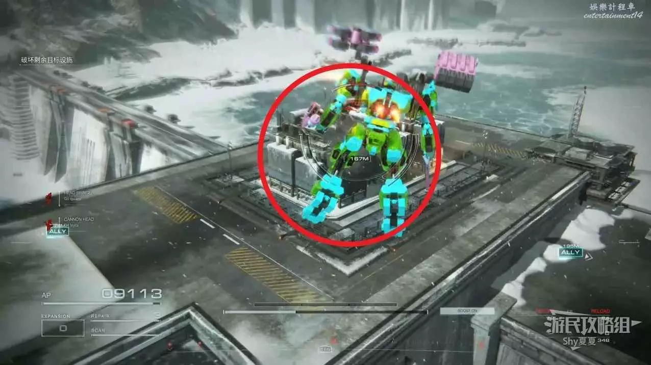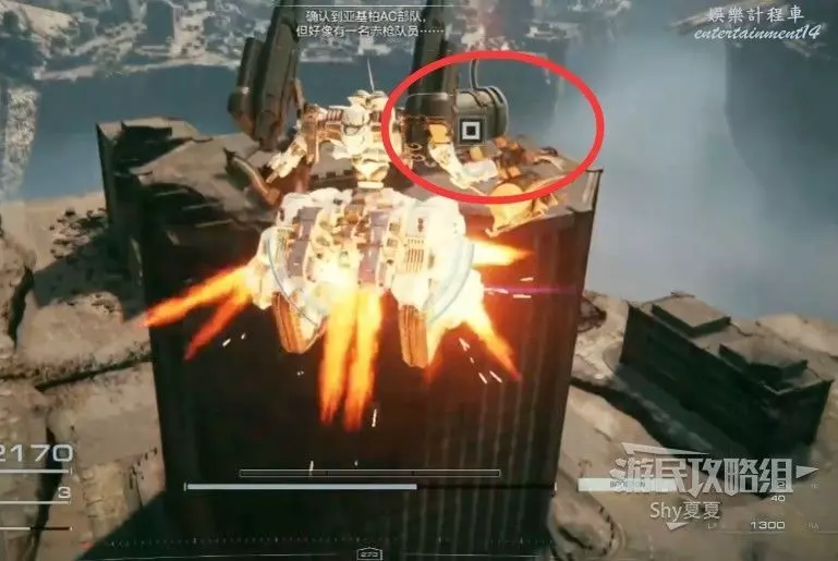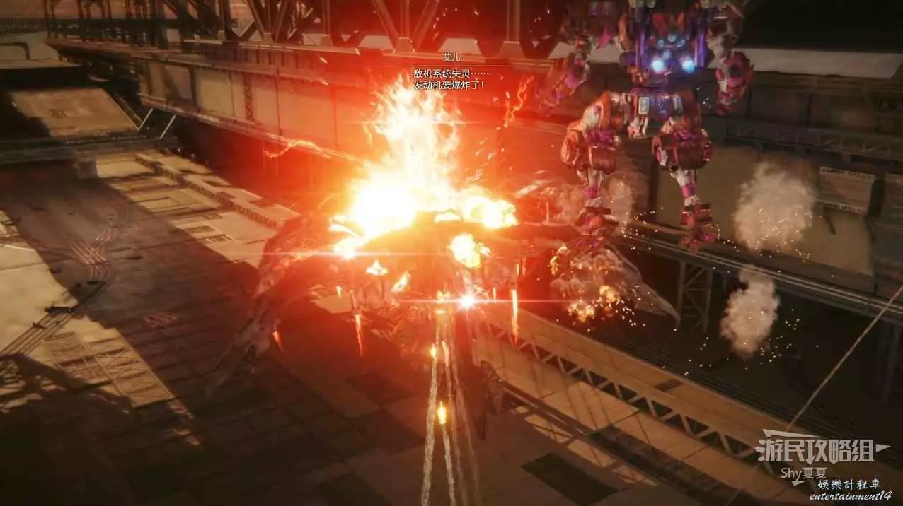 本關有持有護盾的敵人,可以近戰武器破防,可繞後攻擊,可用導彈轟炸,但是最好用的還是飛到他的頭頂直接攻擊。