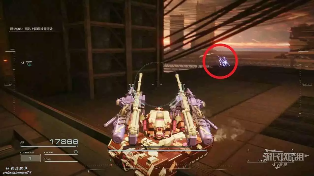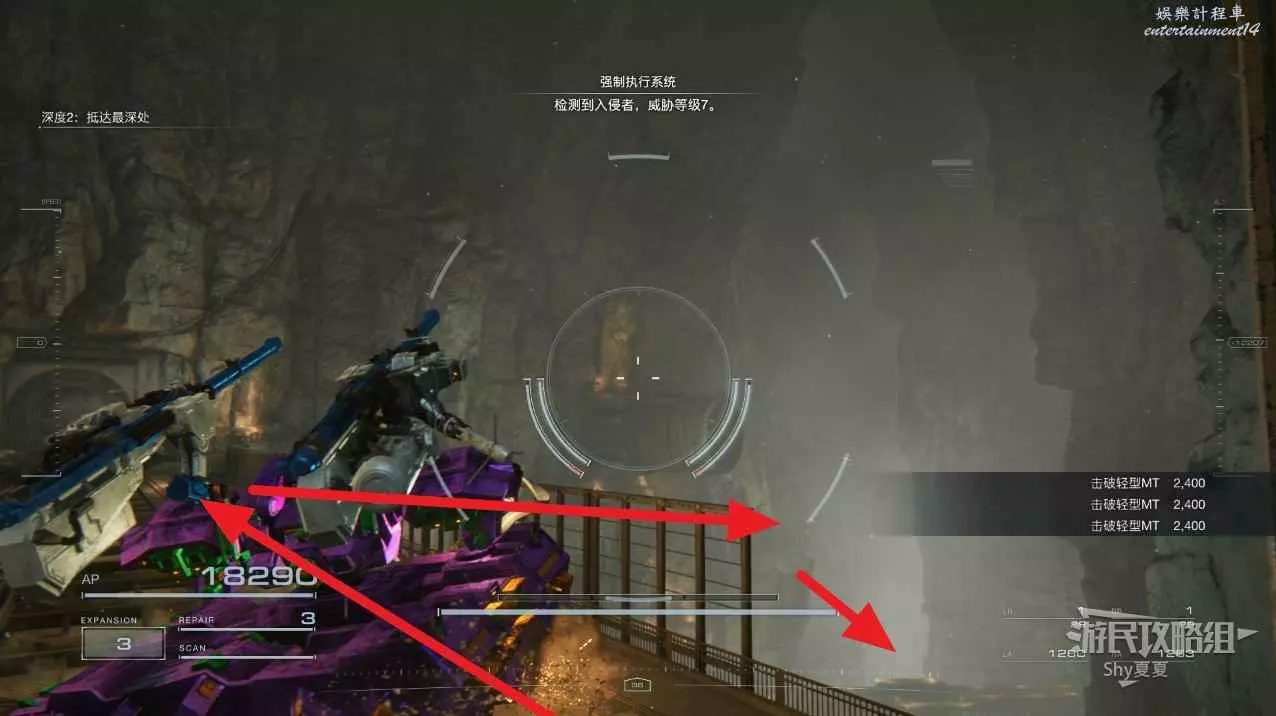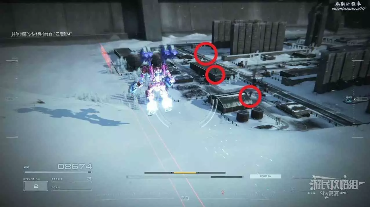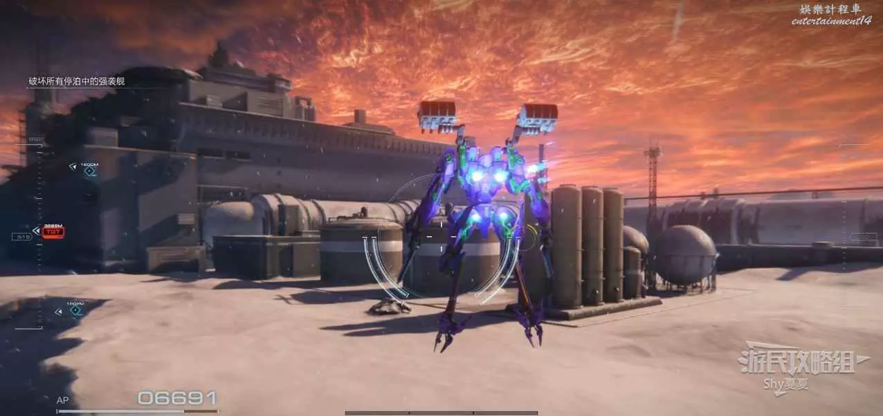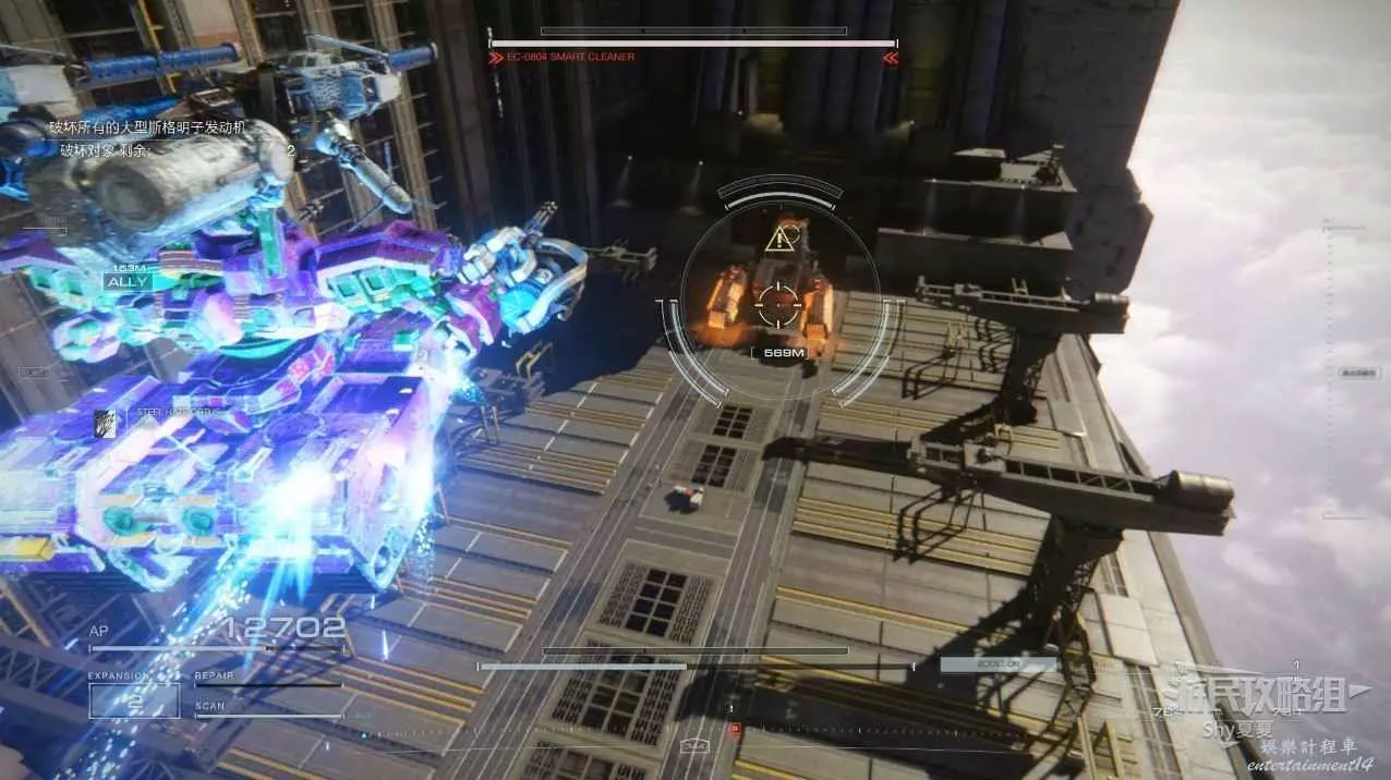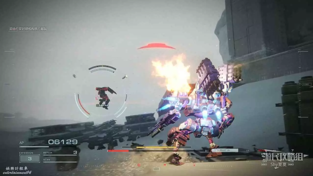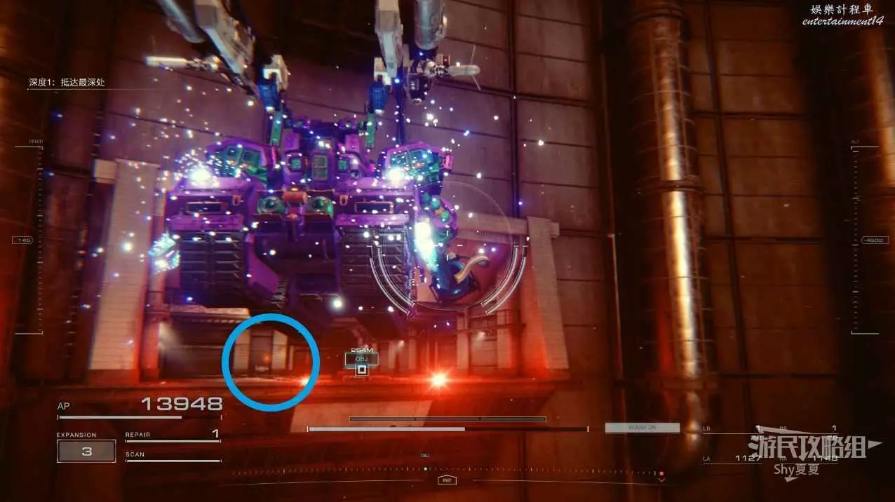 本關有持有護盾的敵人,可以近戰武器破防,可繞後攻擊,可用導彈轟炸,但是最好用的還是飛到他的頭頂直接攻擊。