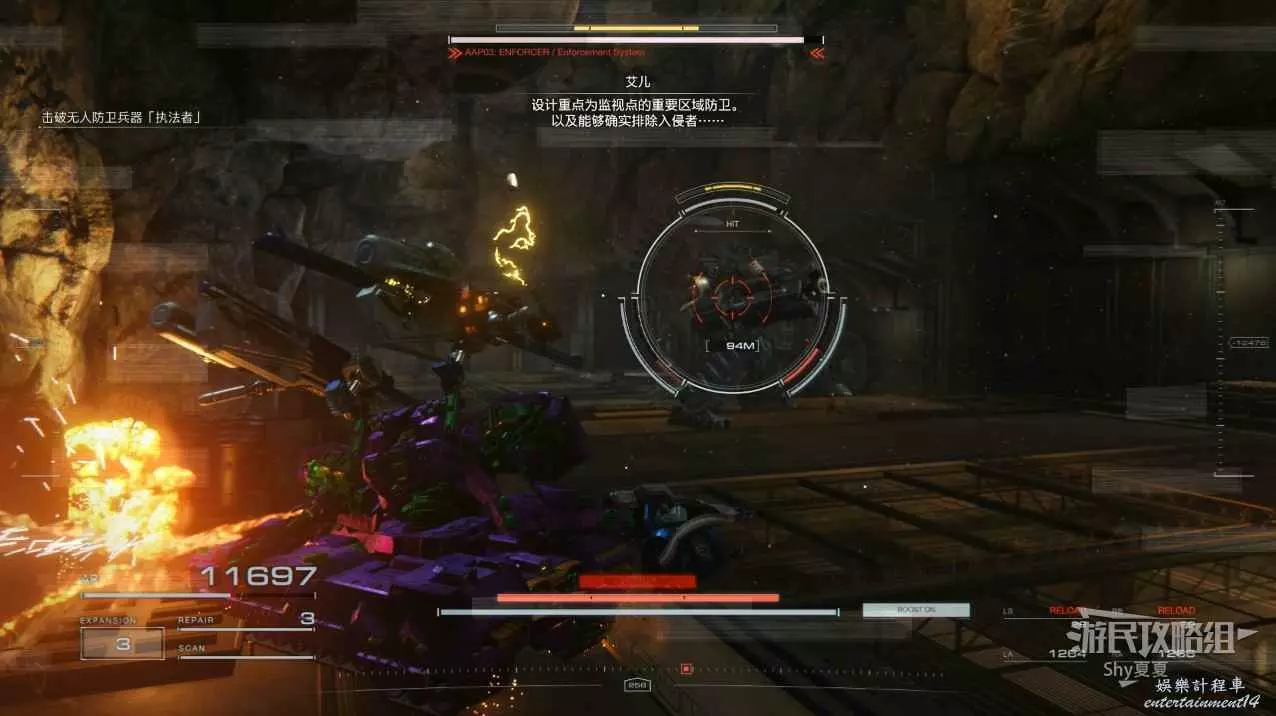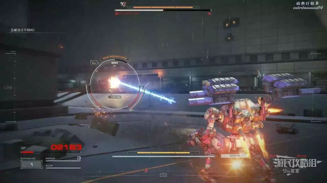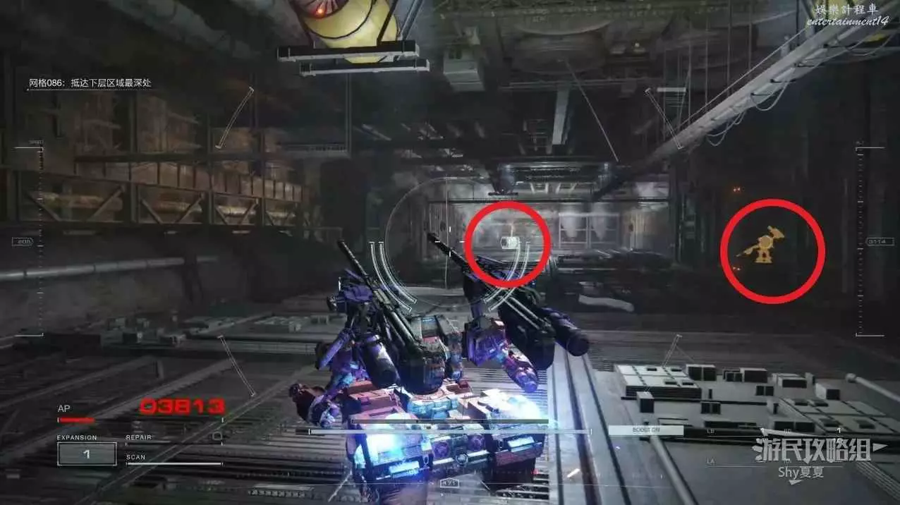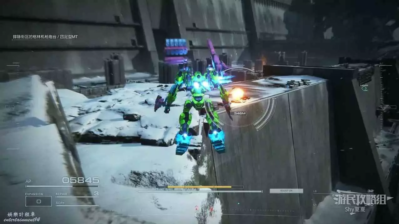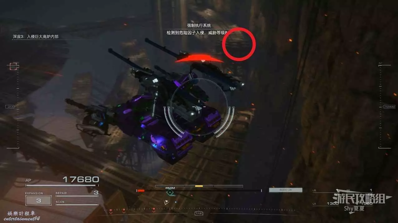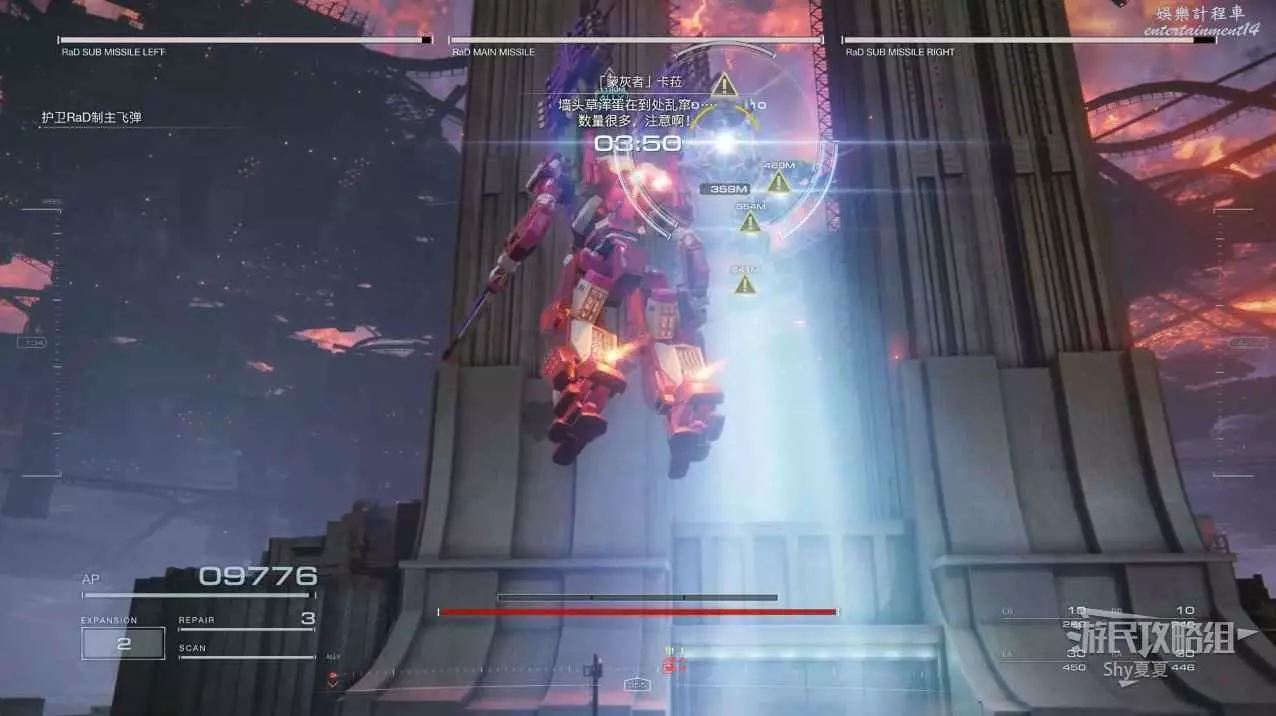 本關有持有護盾的敵人,可以近戰武器破防,可繞後攻擊,可用導彈轟炸,但是最好用的還是飛到他的頭頂直接攻擊。
