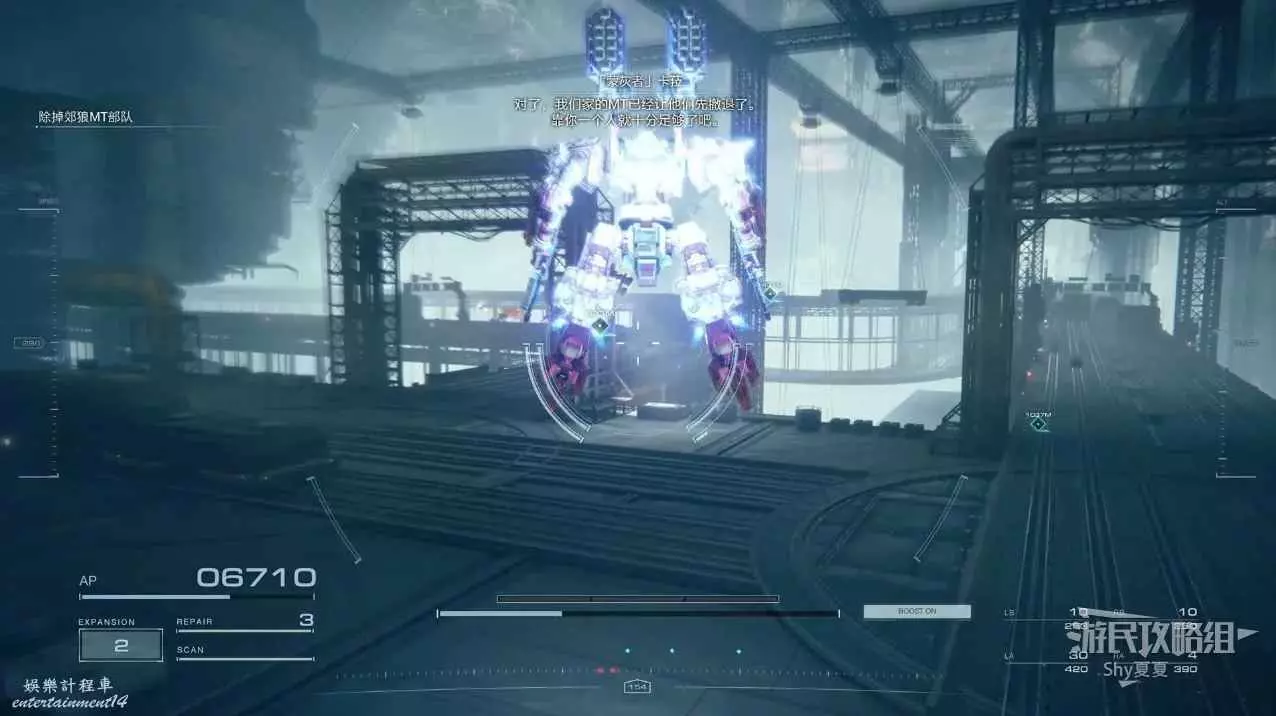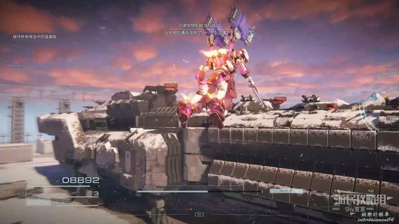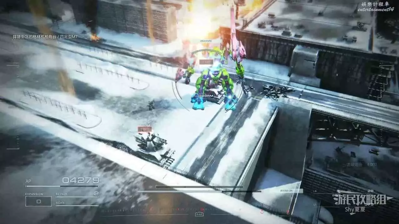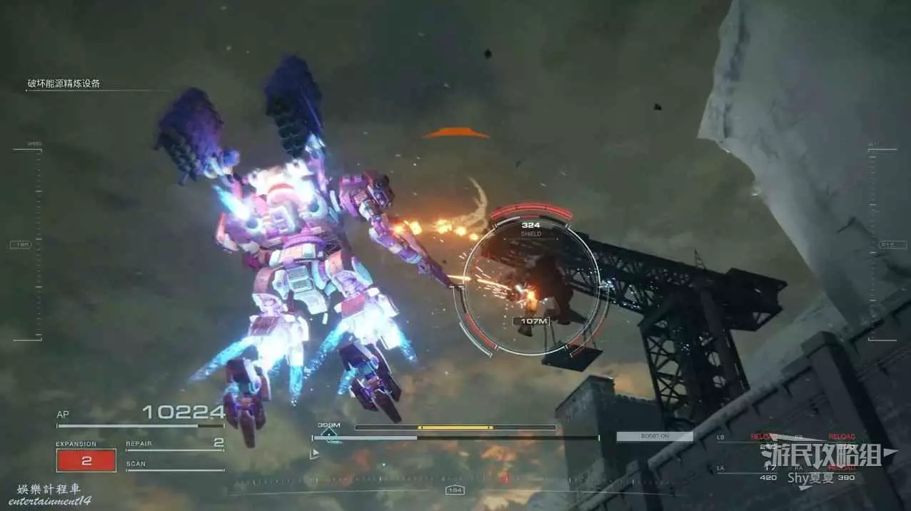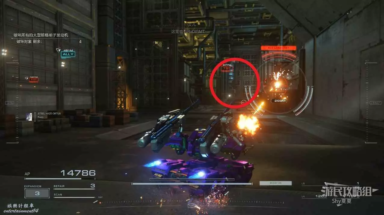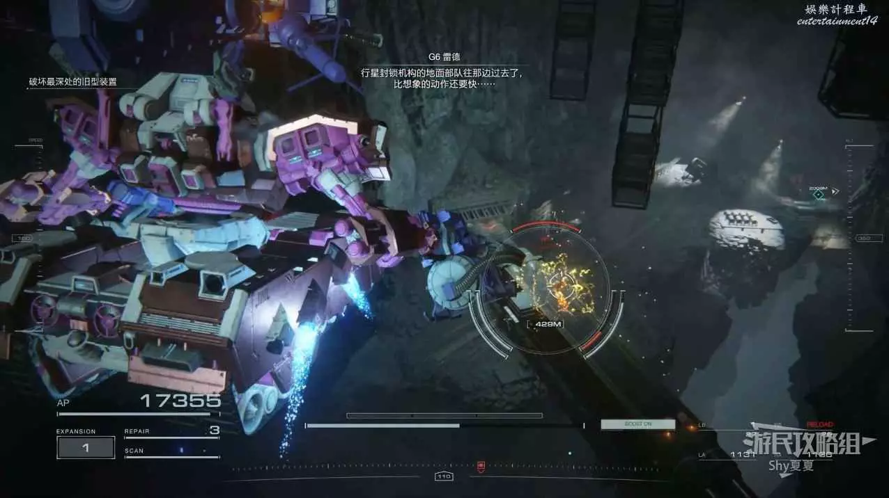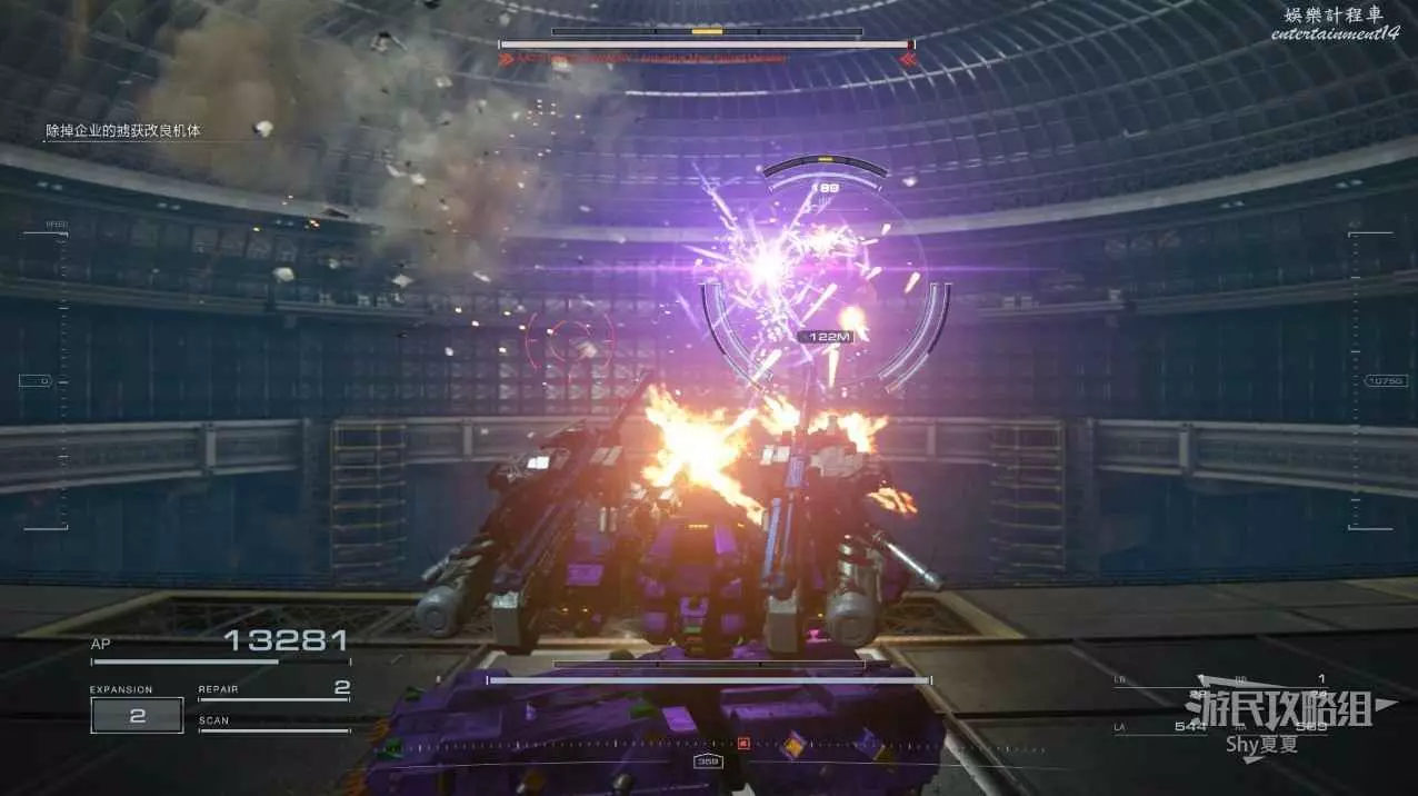 本關有持有護盾的敵人,可以近戰武器破防,可繞後攻擊,可用導彈轟炸,但是最好用的還是飛到他的頭頂直接攻擊。