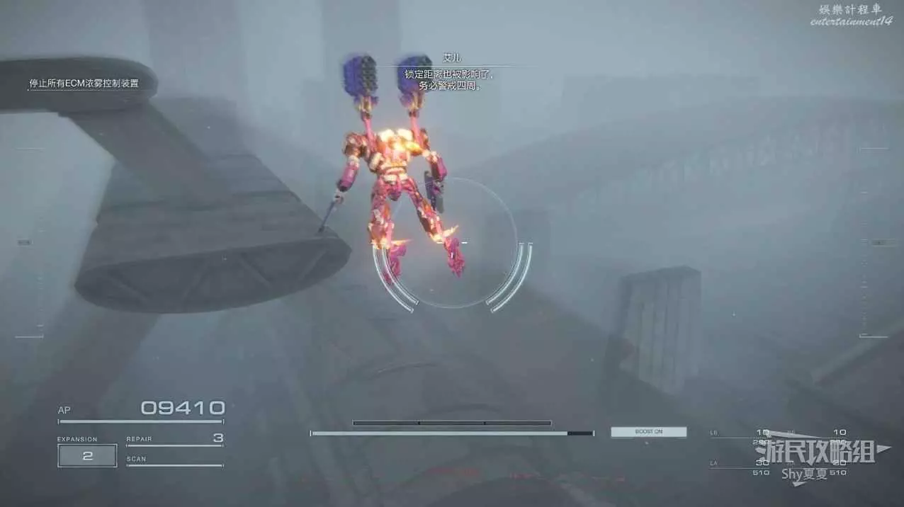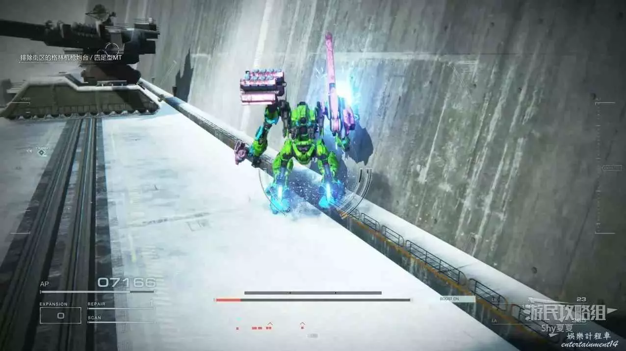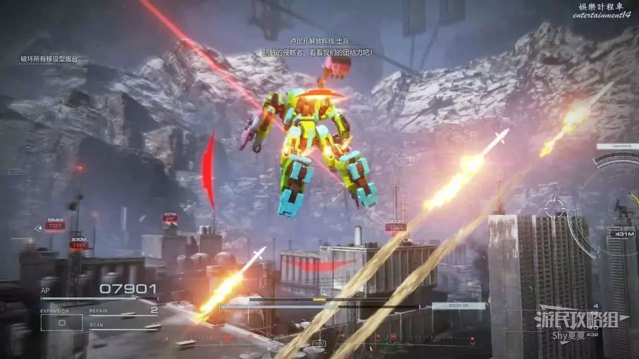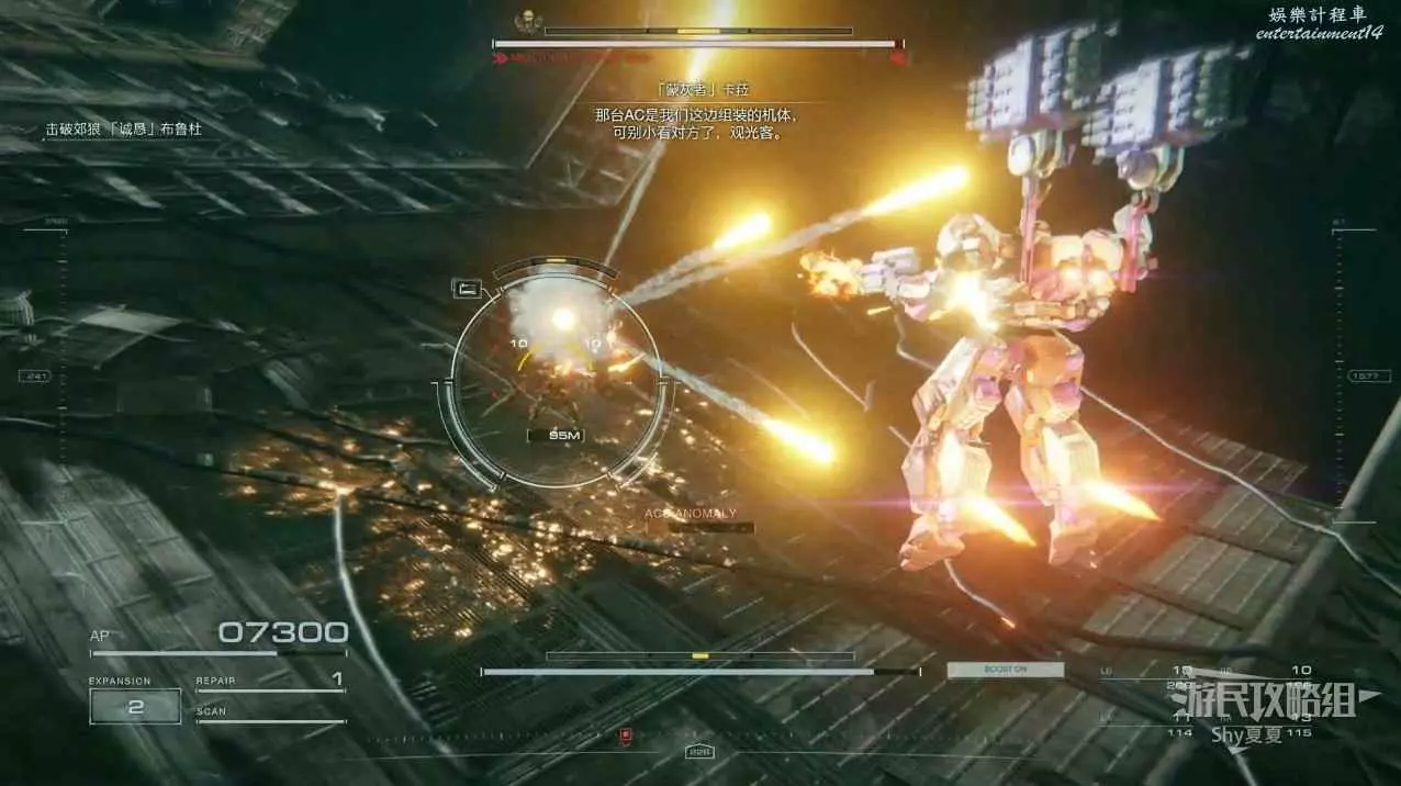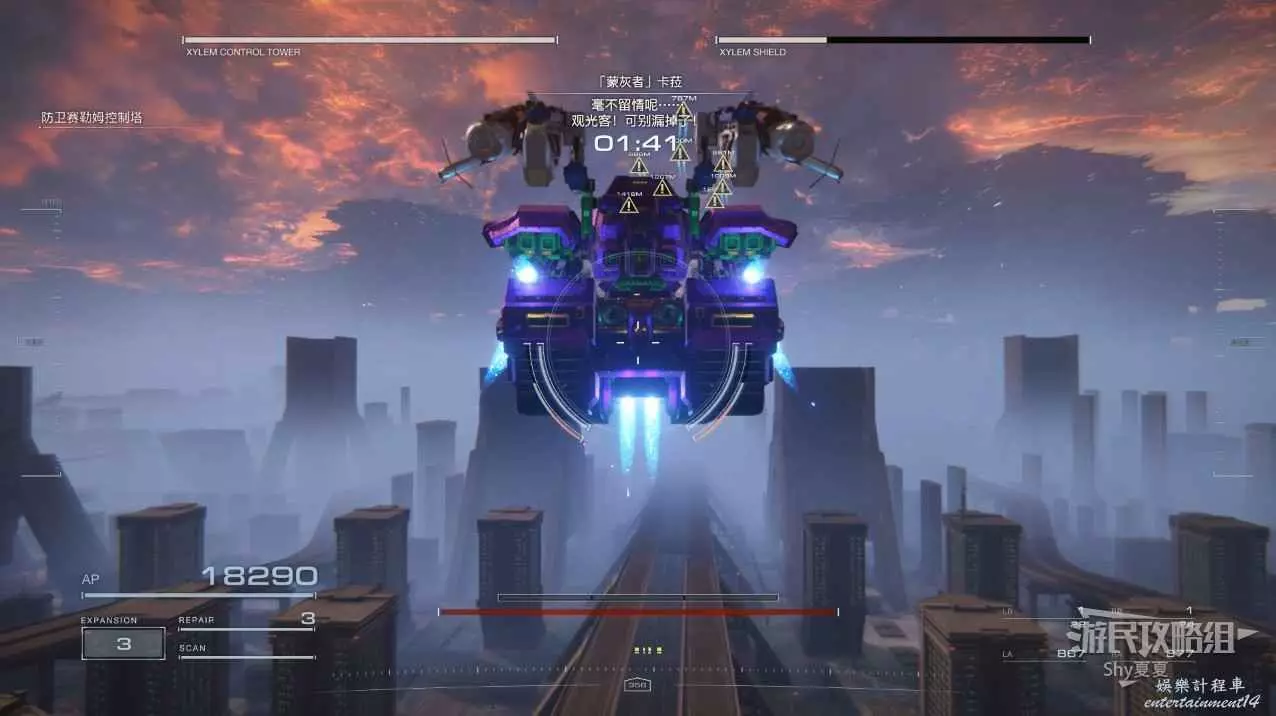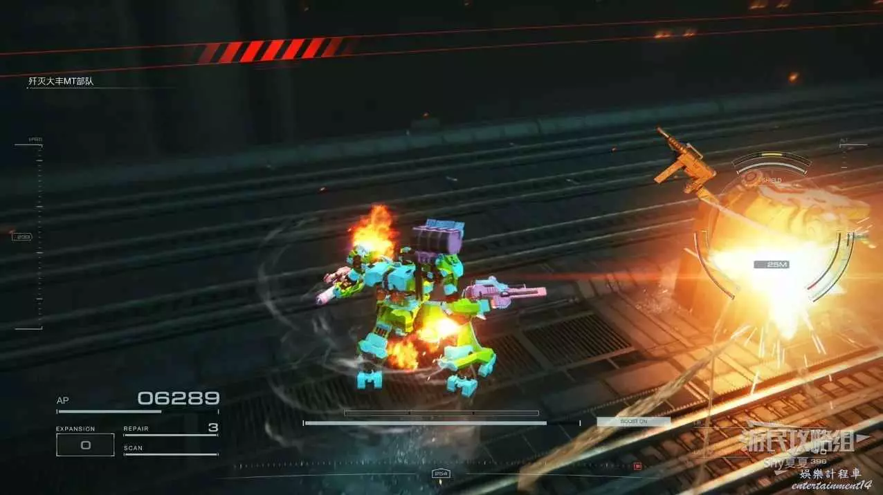 本關有持有護盾的敵人,可以近戰武器破防,可繞後攻擊,可用導彈轟炸,但是最好用的還是飛到他的頭頂直接攻擊。
