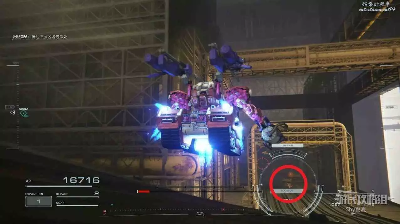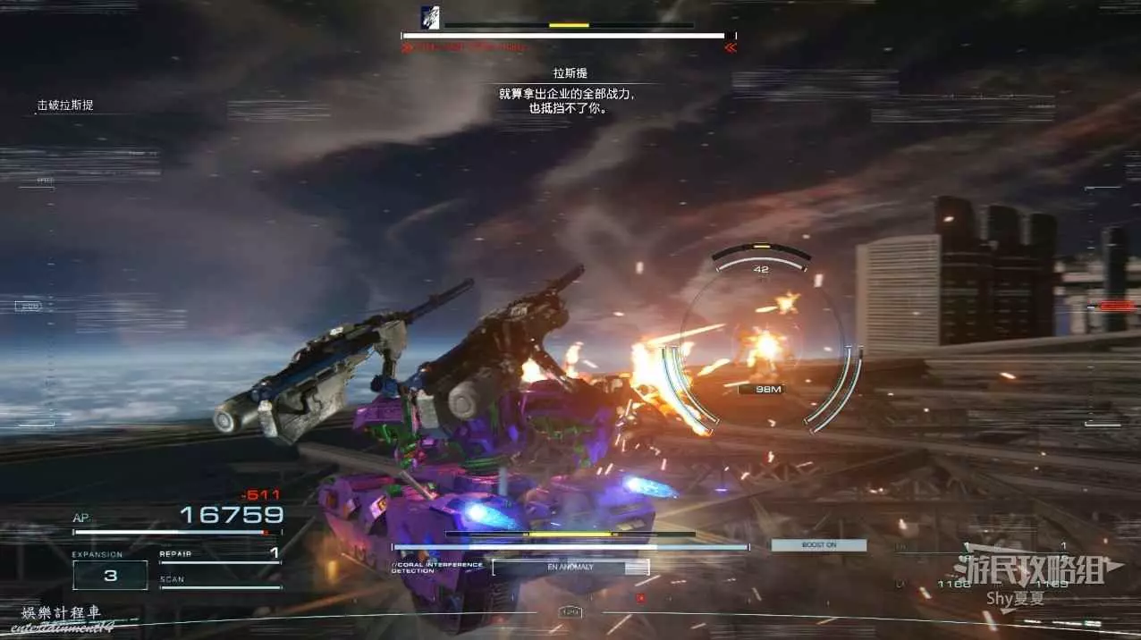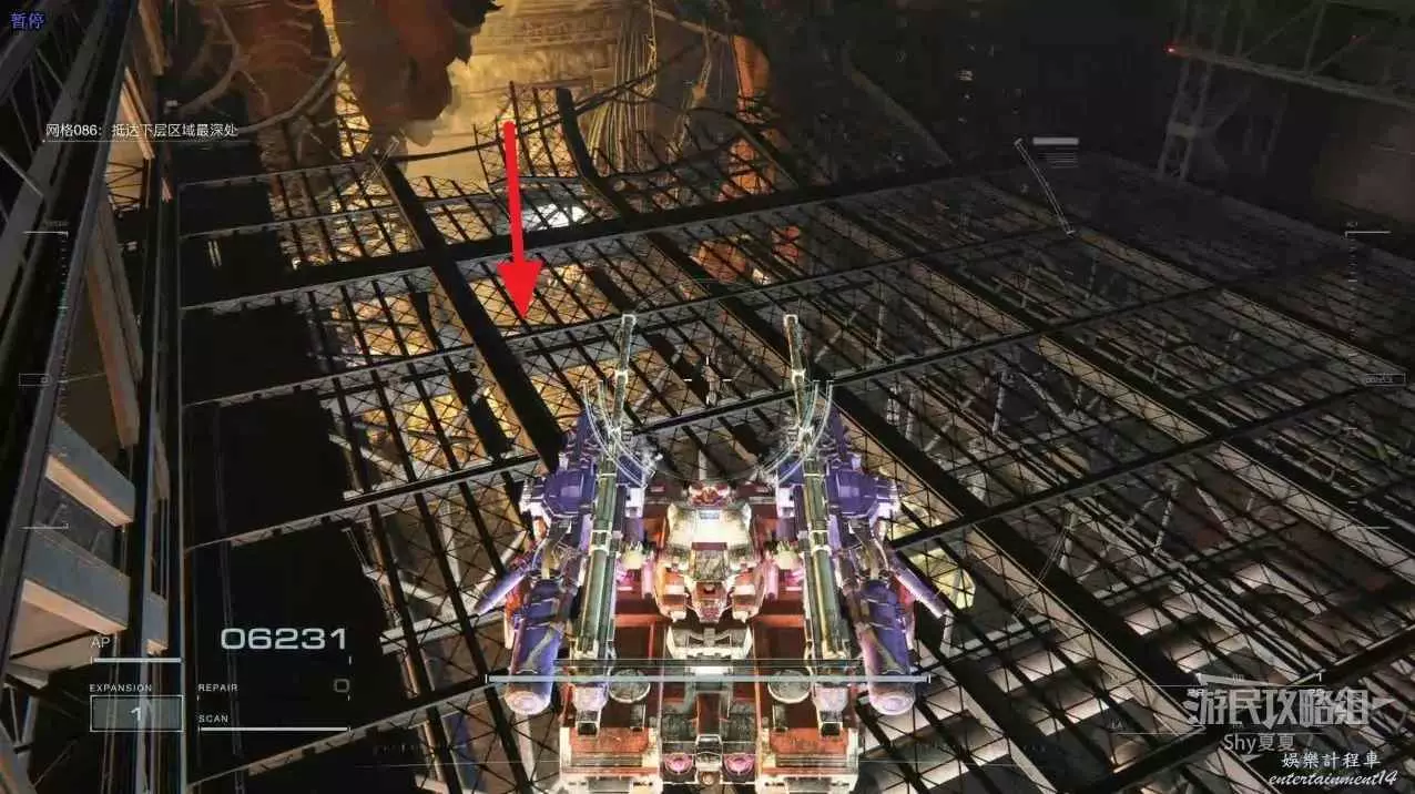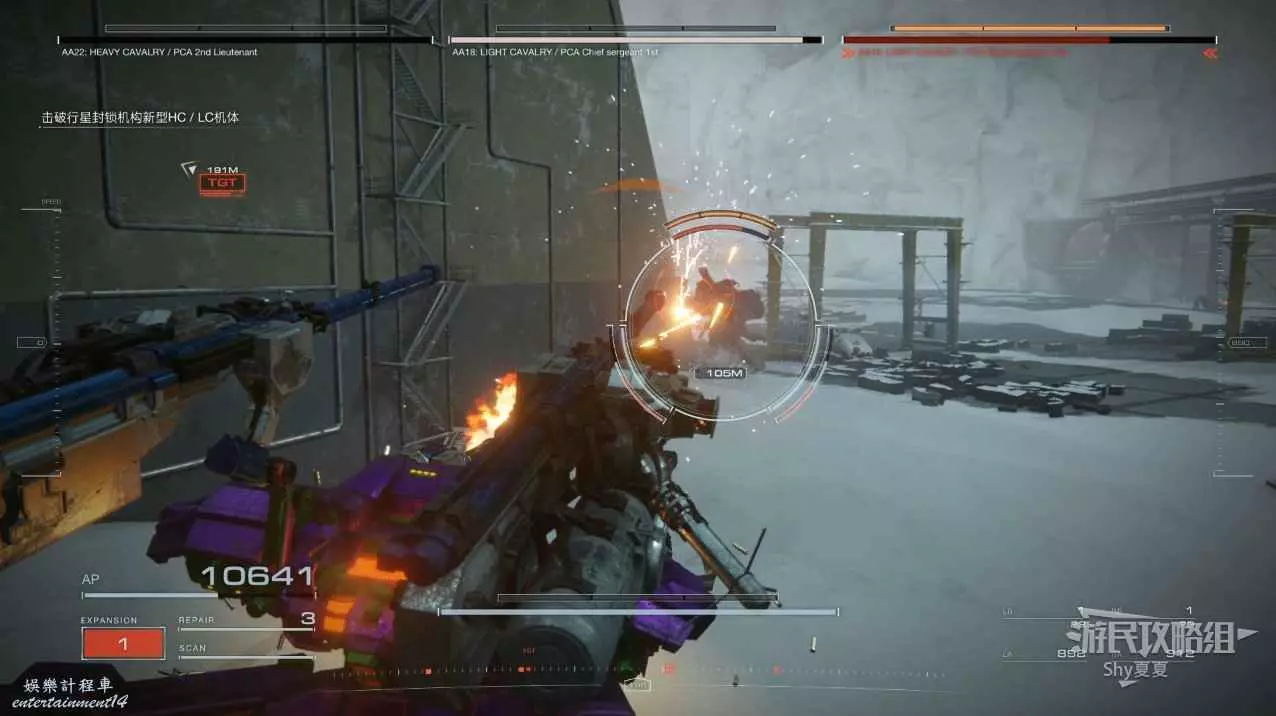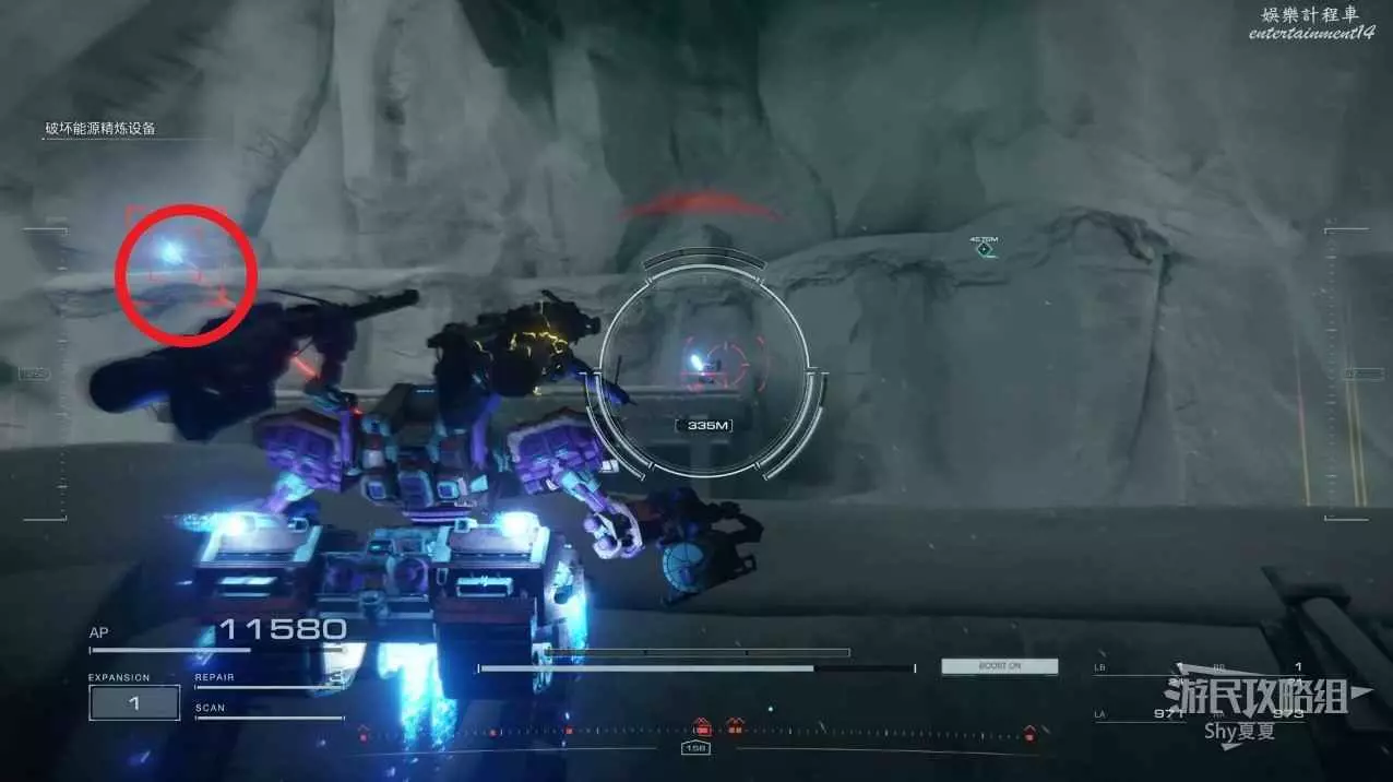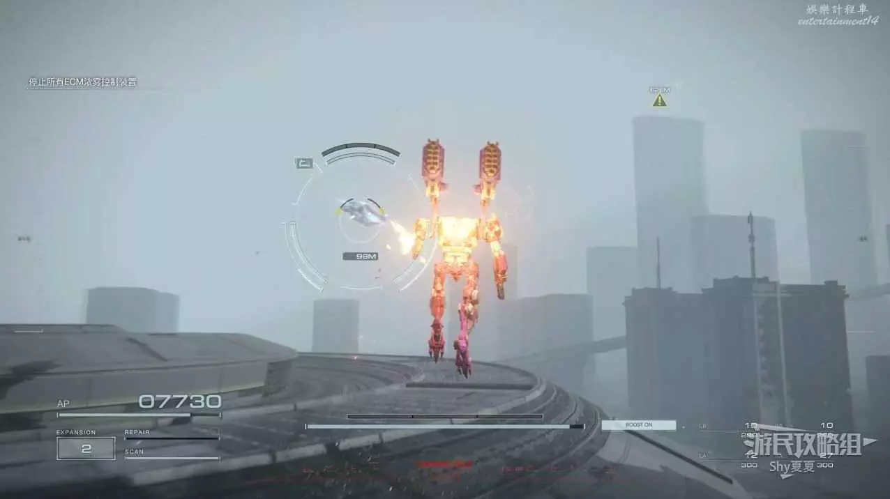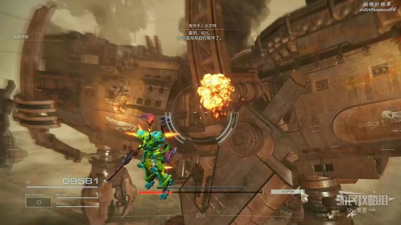 本關有持有護盾的敵人,可以近戰武器破防,可繞後攻擊,可用導彈轟炸,但是最好用的還是飛到他的頭頂直接攻擊。