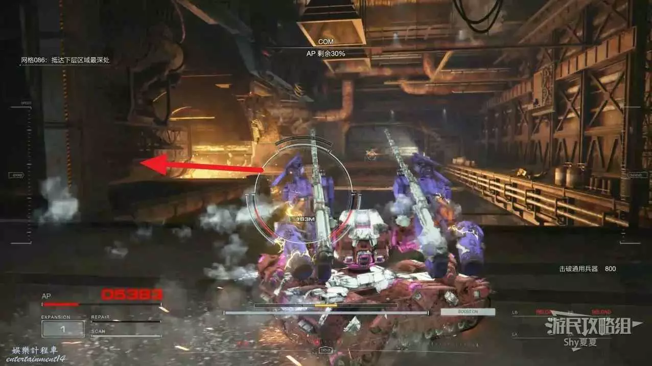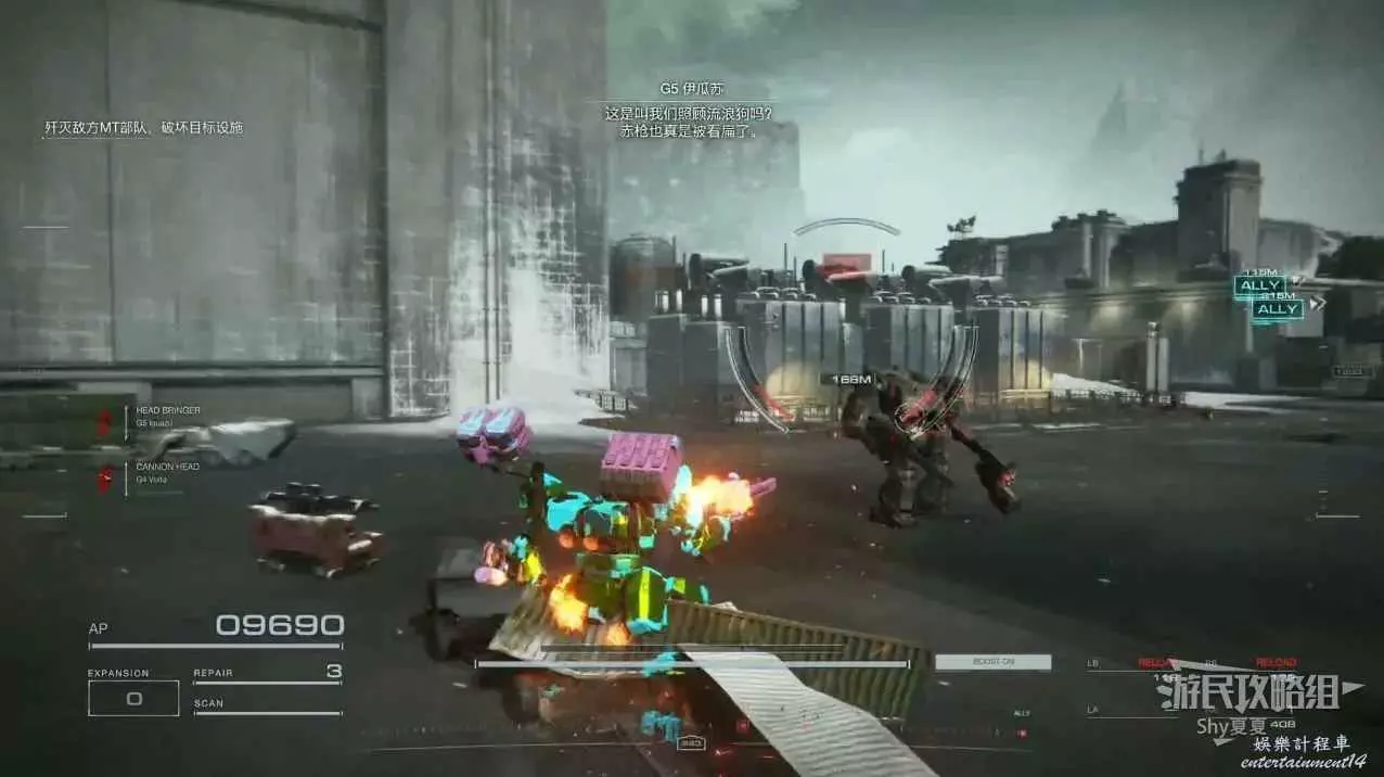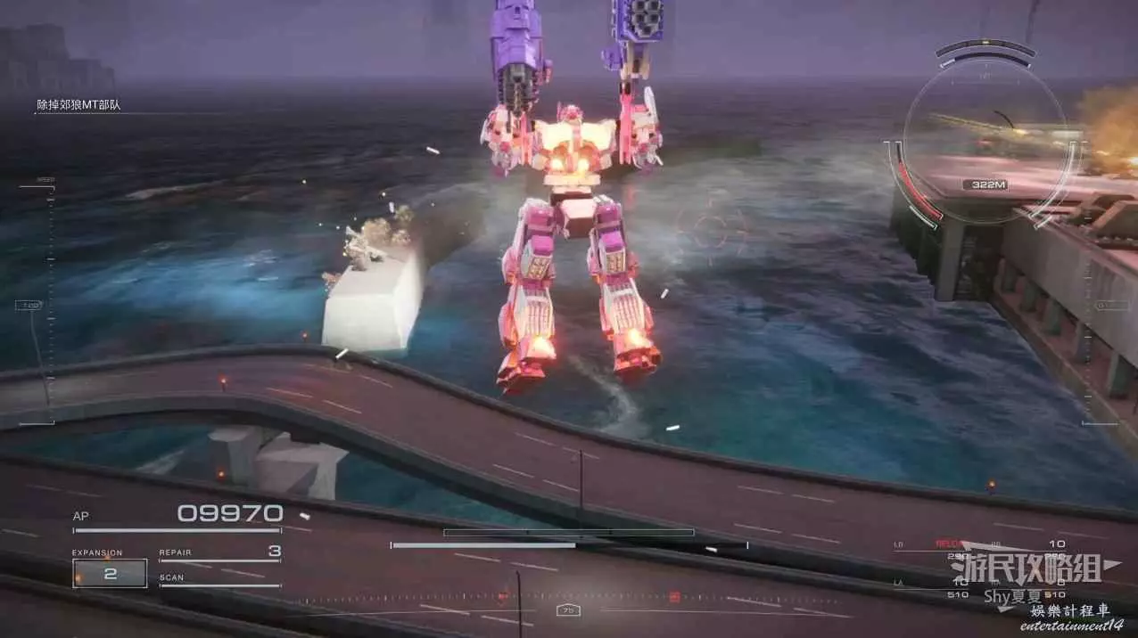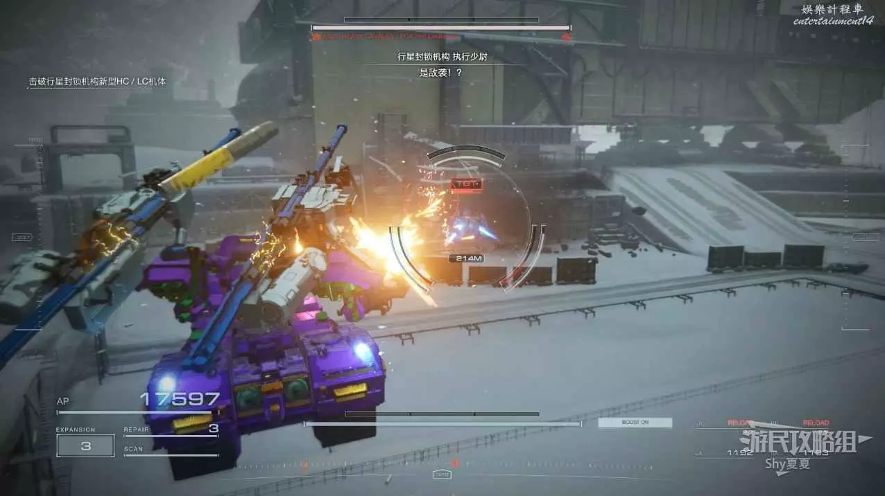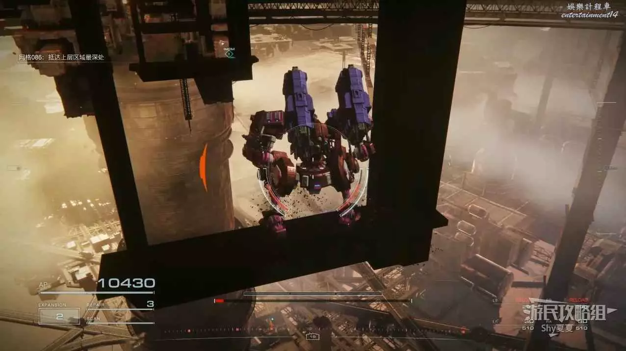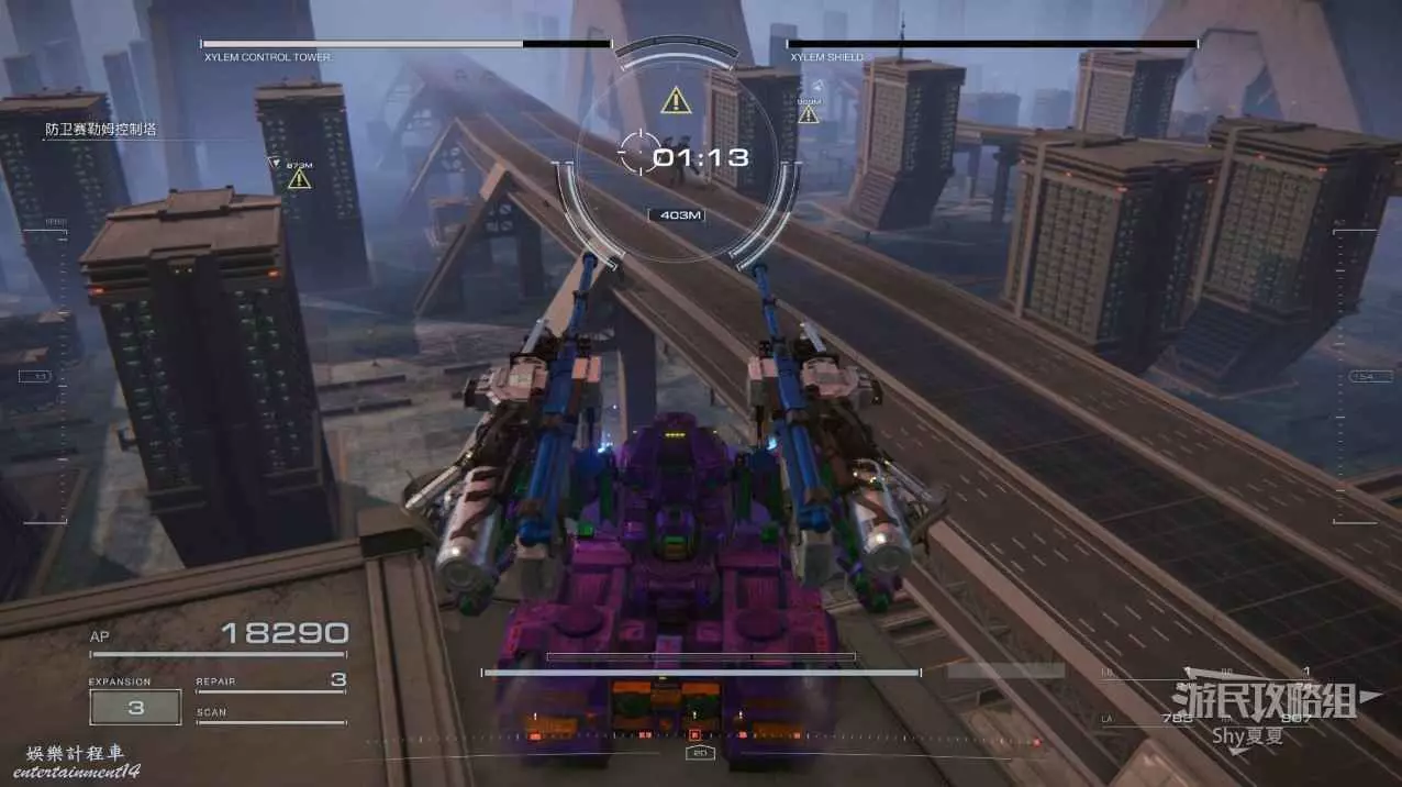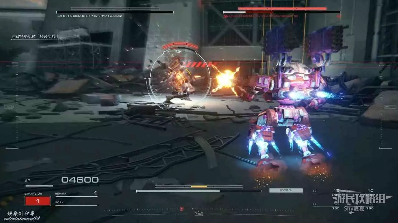 本關有持有護盾的敵人,可以近戰武器破防,可繞後攻擊,可用導彈轟炸,但是最好用的還是飛到他的頭頂直接攻擊。
