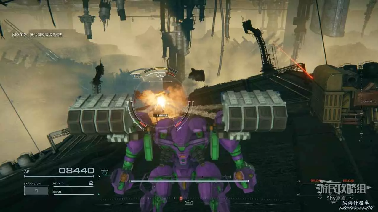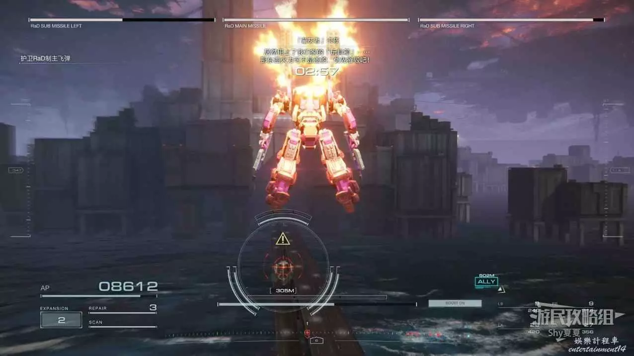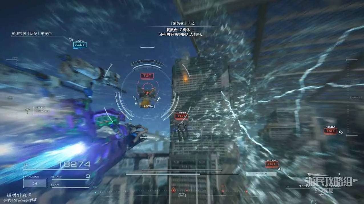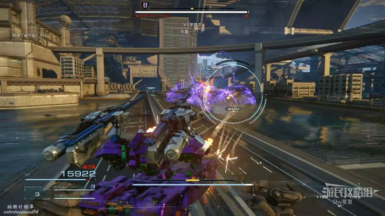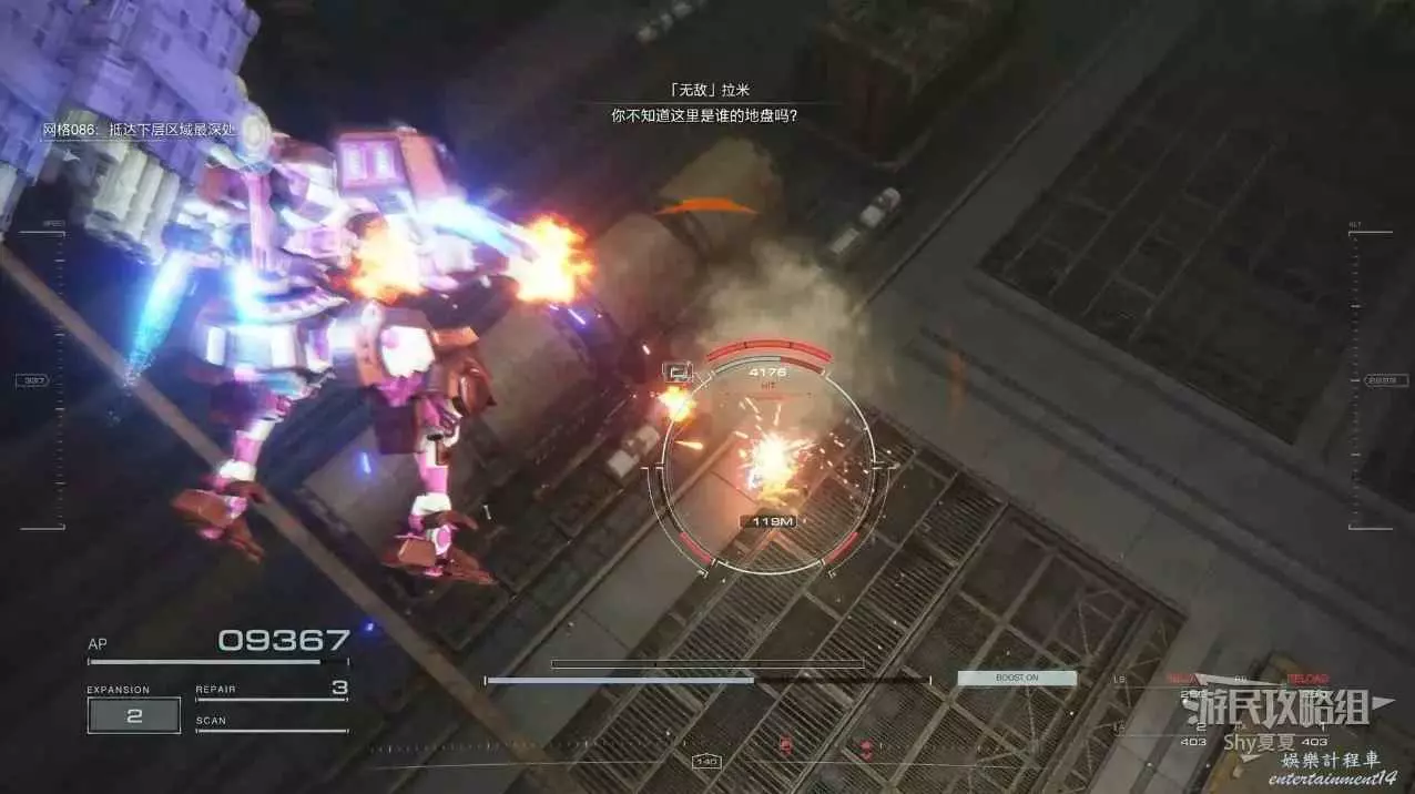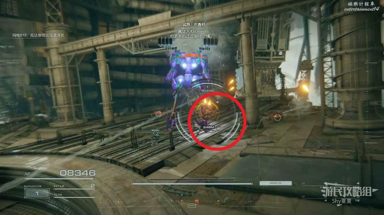 本關有持有護盾的敵人,可以近戰武器破防,可繞後攻擊,可用導彈轟炸,但是最好用的還是飛到他的頭頂直接攻擊。