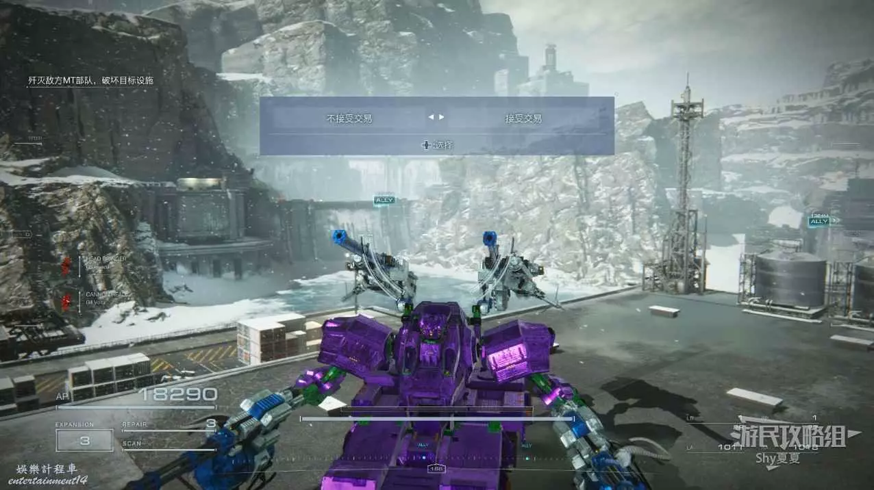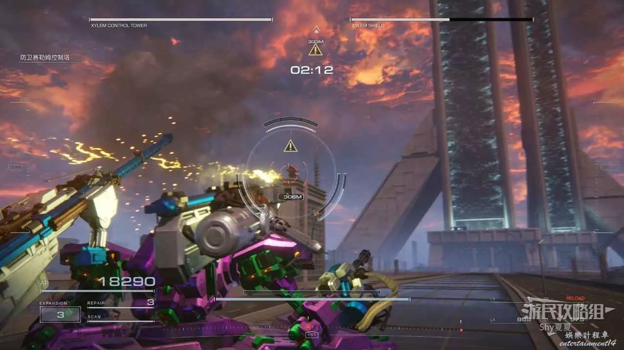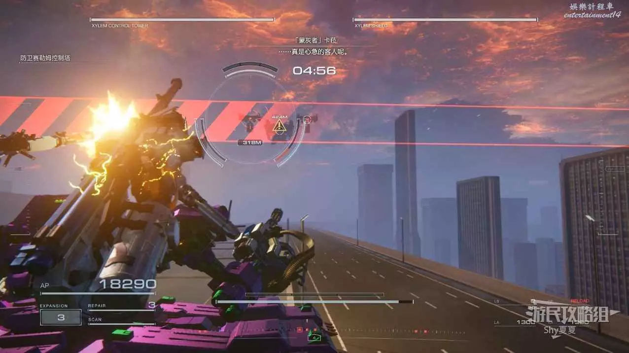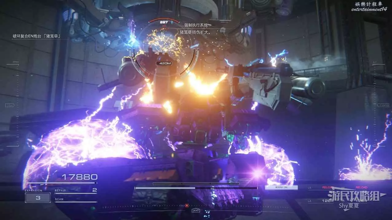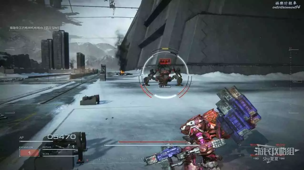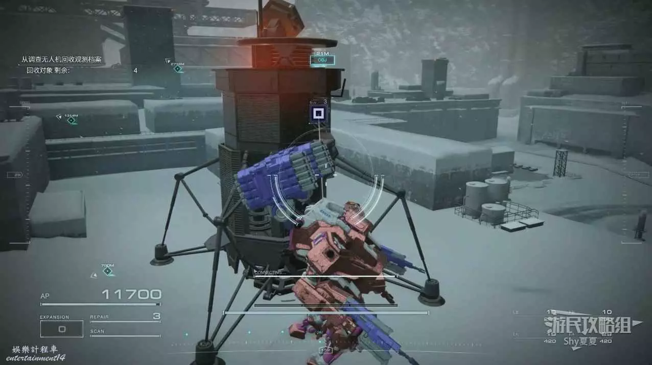 本關有持有護盾的敵人,可以近戰武器破防,可繞後攻擊,可用導彈轟炸,但是最好用的還是飛到他的頭頂直接攻擊。