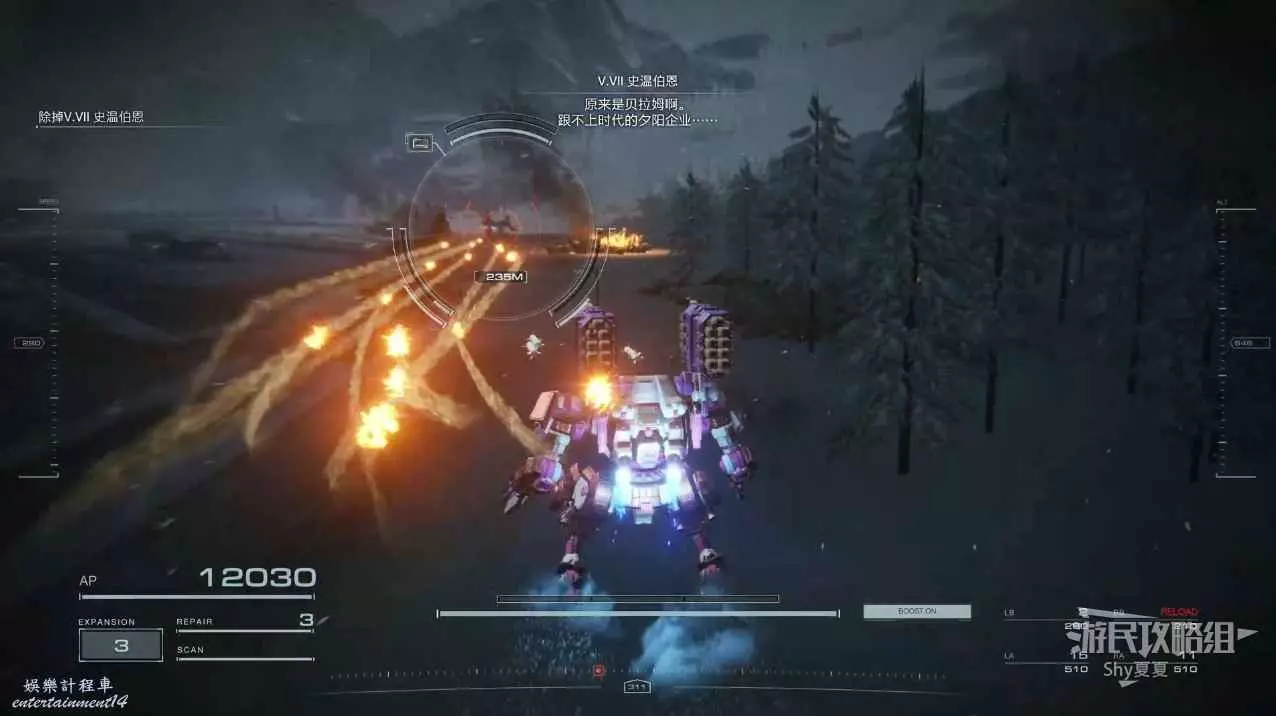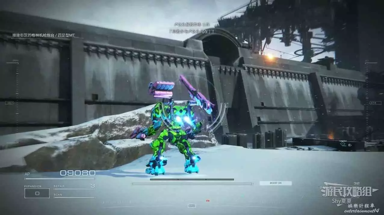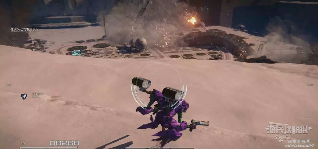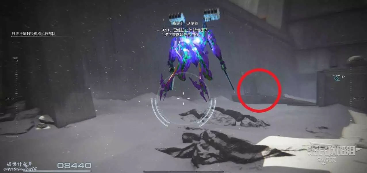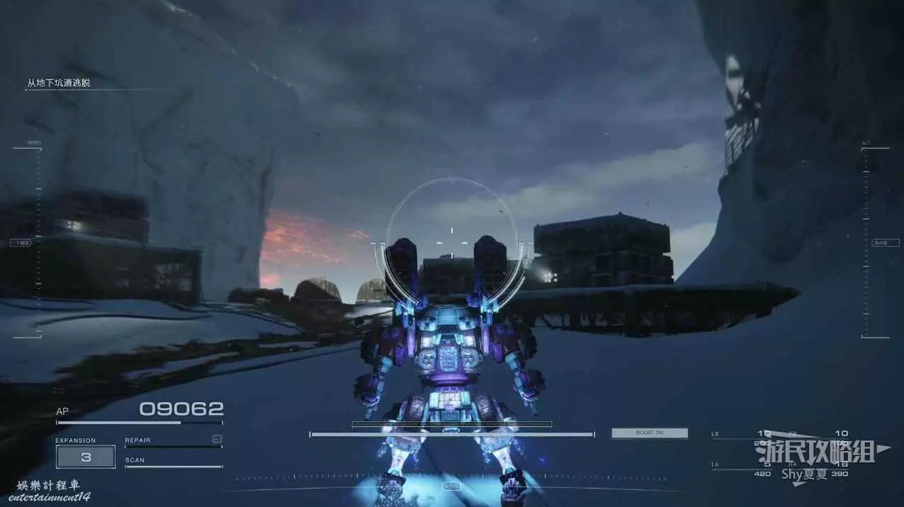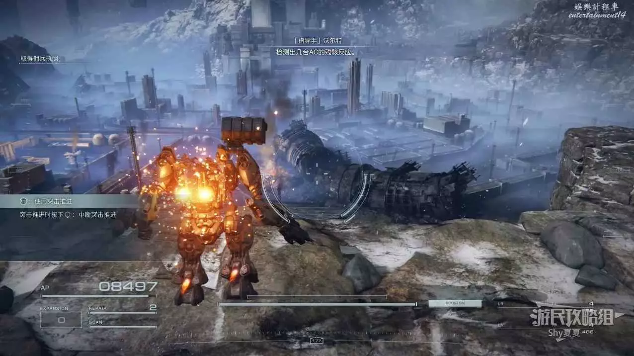 進入遊戲後,直接就要駕駛機甲行動,在這裡跟著提示熟悉一下基本的操作,了解一下專有名詞。一路過關斬將,就會被發射到雪地。
