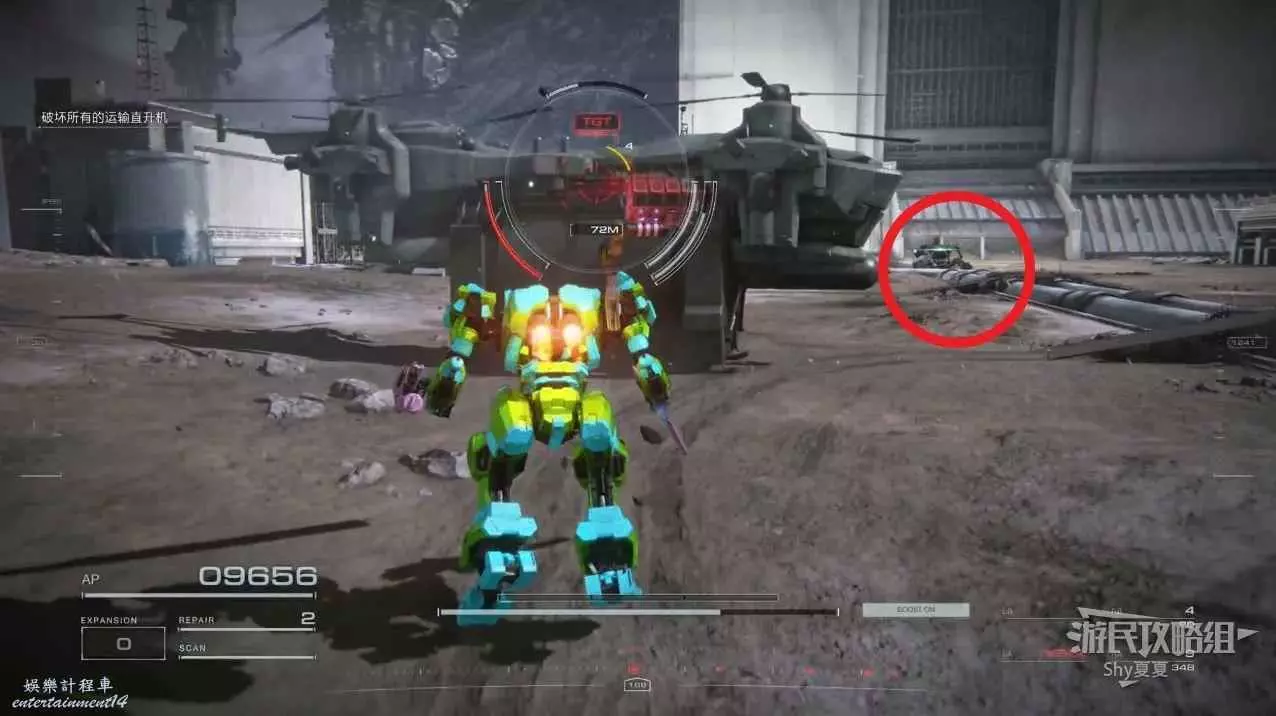 本關開始後,會使用基礎機體進行戰鬥,首先在前方擊敗兩名敵人,看到使用導彈的敵人後,直接向右轉,從另一側繞過去。