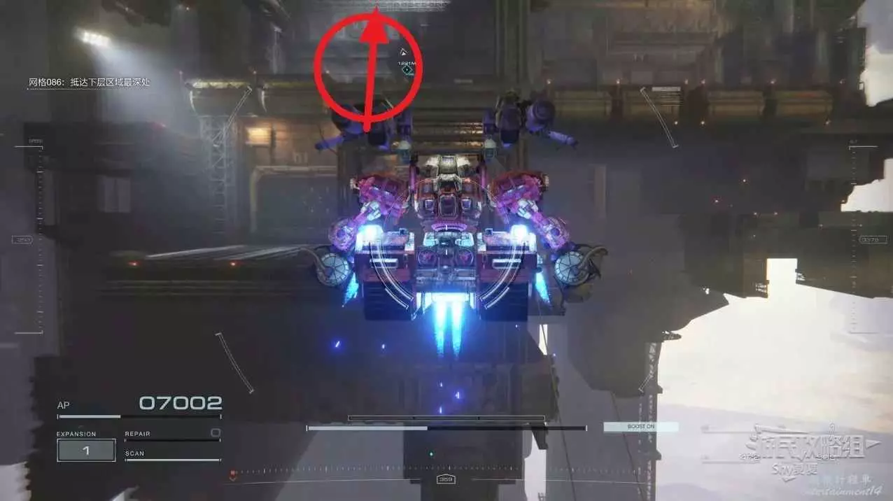 這一關屬於機制BOSS戰,首先我們靠近遠處隱約可見行走的機械。飛過去的過程中要小心鐳射,鐳射會從下往上掃過,利用閃避衝刺可以躲開。其次不建議走著過去,BOSS導彈的覆蓋比較難躲。