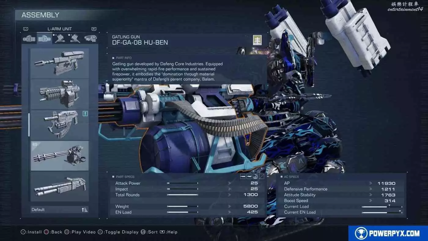 此武器在近距離表現最佳,即使面對能偏轉子彈的對手,也能快速使其產生硬直,並在硬直期間繼續打出大量傷害。不過其過熱階段相當於一個比較大的真空期,可以使用下面介紹的左/右肩武器來使敵人硬直,等待冷卻後再近距離使用格林機槍。此外如果使用重坦BD(可獲得更多血量和防禦性能),比起在地面駕駛,保持在敵人上空盤旋會更容易操控一些。
