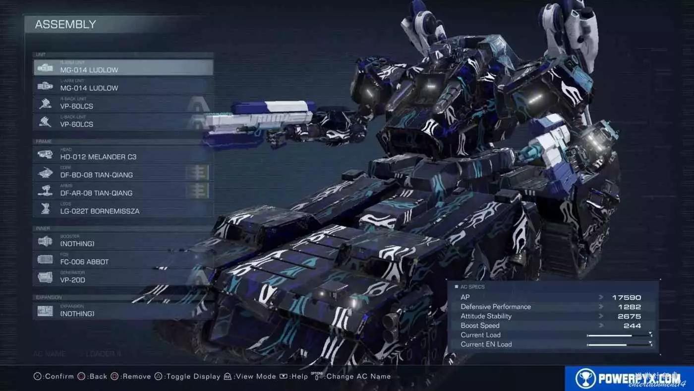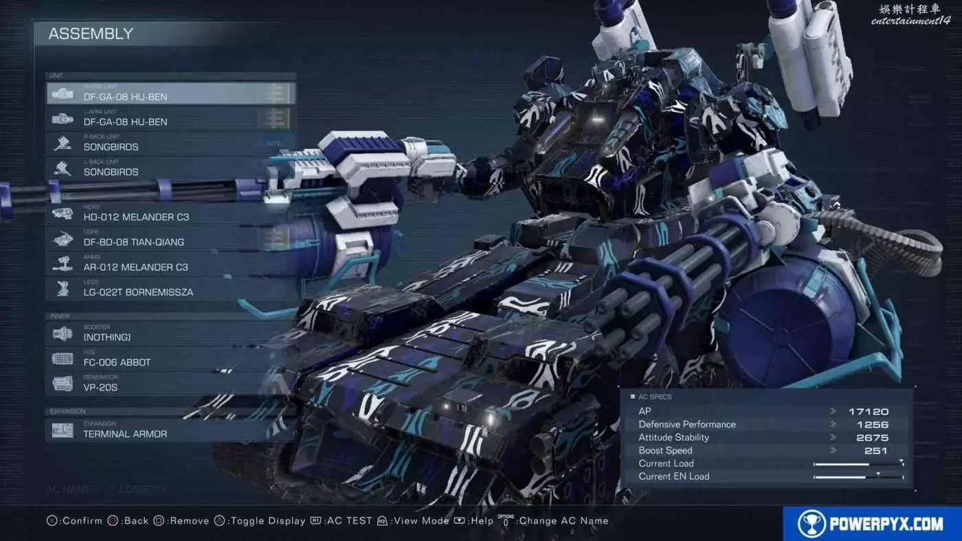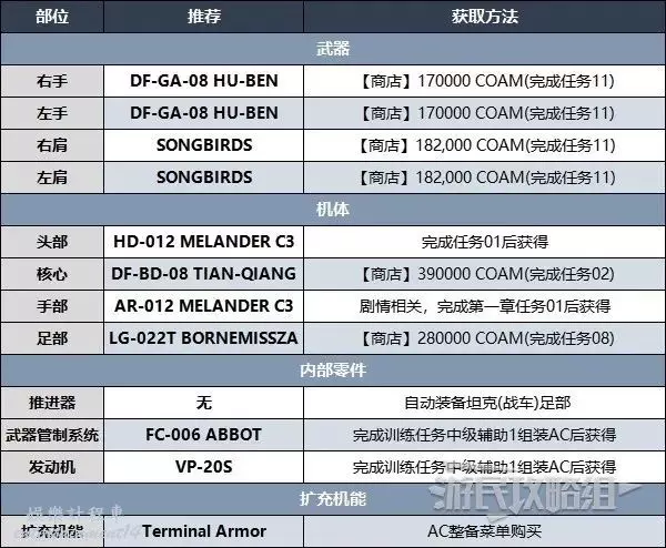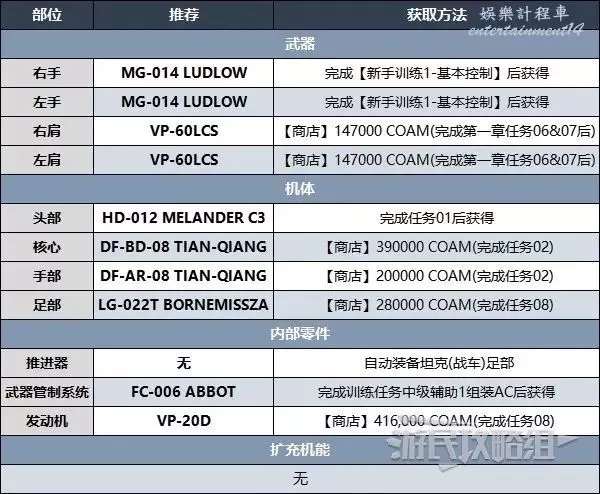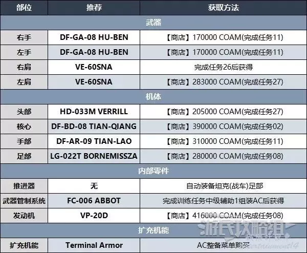 此BD最重要的部分是足部,後面有兩把VP-60LCS雷射武器來打出可觀的衝擊傷害,並且在過熱之前可以快速連續射擊,能夠迅速使敵人硬直。然後雙持機槍也能在硬直期間打出超高傷害。此BD非常易於使用,點擊【L1/R1】快速射擊肩部武器,按住【L2/R2】快速射擊手持武器,按【×鍵/A鍵】飛行靠近空中的敵人(儘量在敵人上方空域)。使用此BD時儘量避免在地面行駛,在空中更容易控制,靠近敵人可增加傷害,不然子彈容易偏移方向。完成任務08後就能獲得所有零件。可以多做幾次任務06來輕鬆賺錢,只需摧毀任務重的主要目標即可,每次只需90秒,可獲得180000 COAM。
