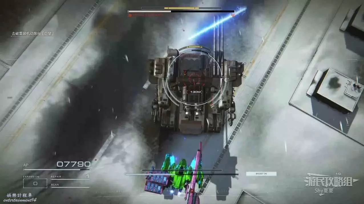 調查殘骸後,BOSS就會出現,鎖定BOSS後,直接到機頭上方進行輸出,不斷地移動能夠躲避敵人的子彈攻擊,如果能過落到BOSS上方可以直接使用近戰輸出,傷害可觀。BOSS的彈幕攻擊可以利用場景的掩體進行躲避,快沒體力的時候也可以利用掩體恢復體力。