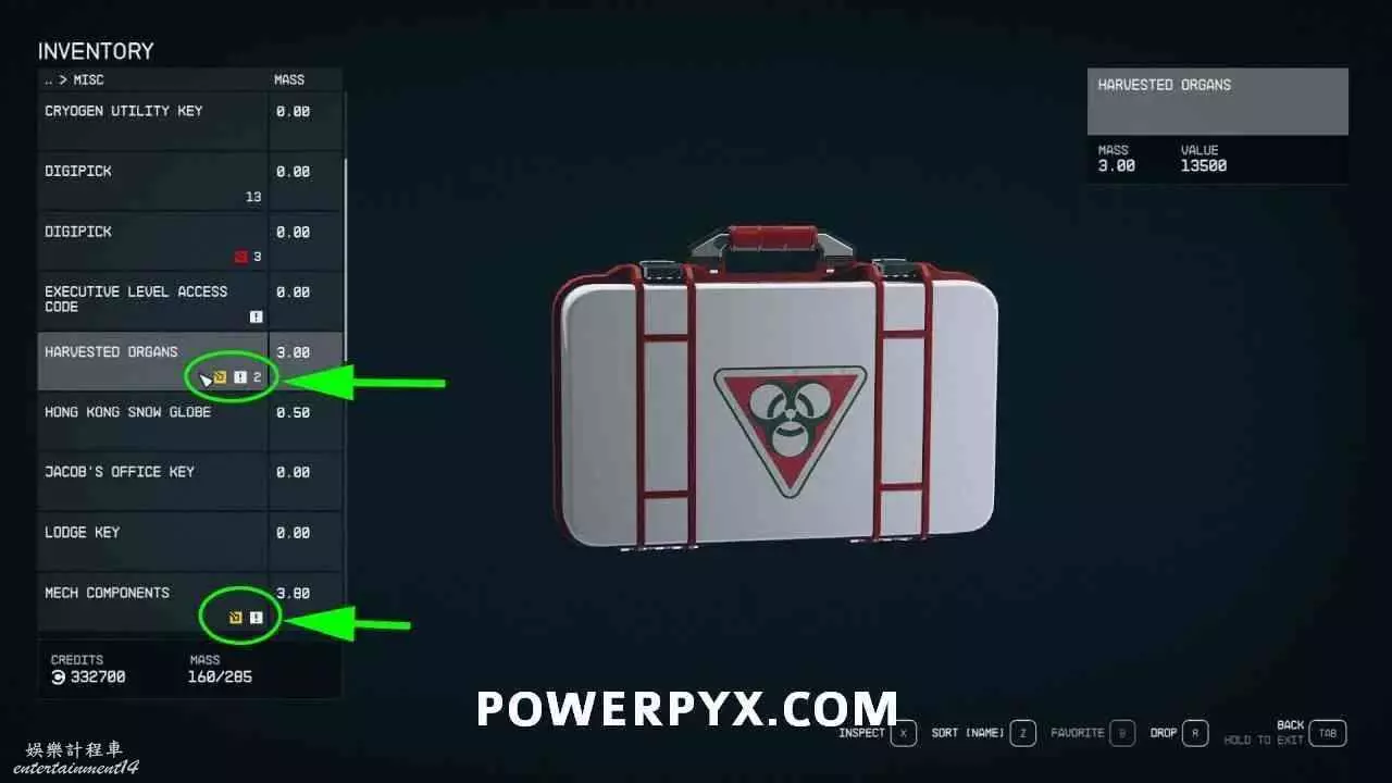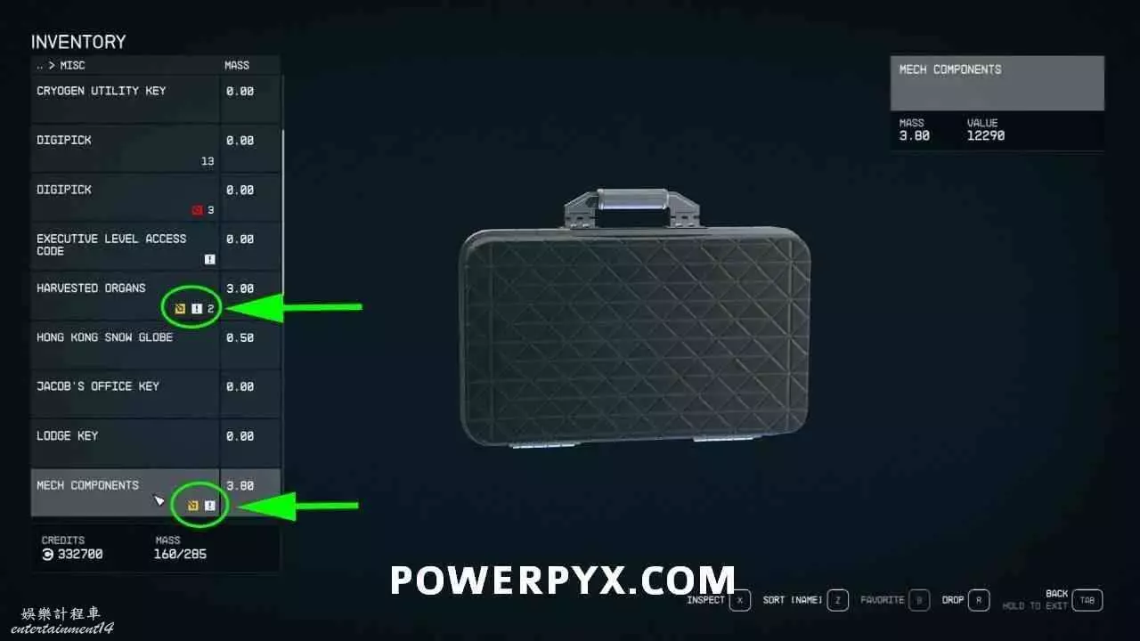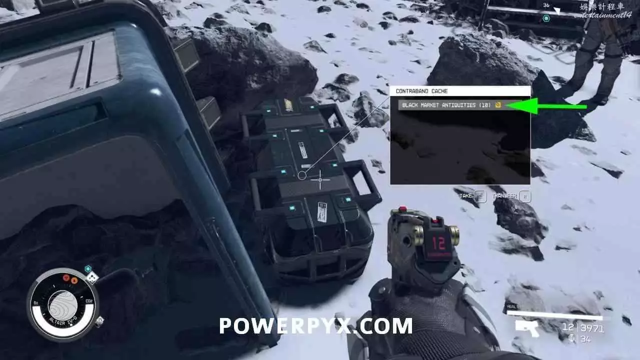 違禁品藏貨是帶有黃色圖示的物品(參考下圖,與紅色標記的可偷取物品不同),這些物品非常罕見,通常在自由探索星球時遇到的興趣點中比較完好的隱蔽位置中。部分藏貨所在位置需要購買科技技能【安保】(等級3)來開鎖才能獲得。
