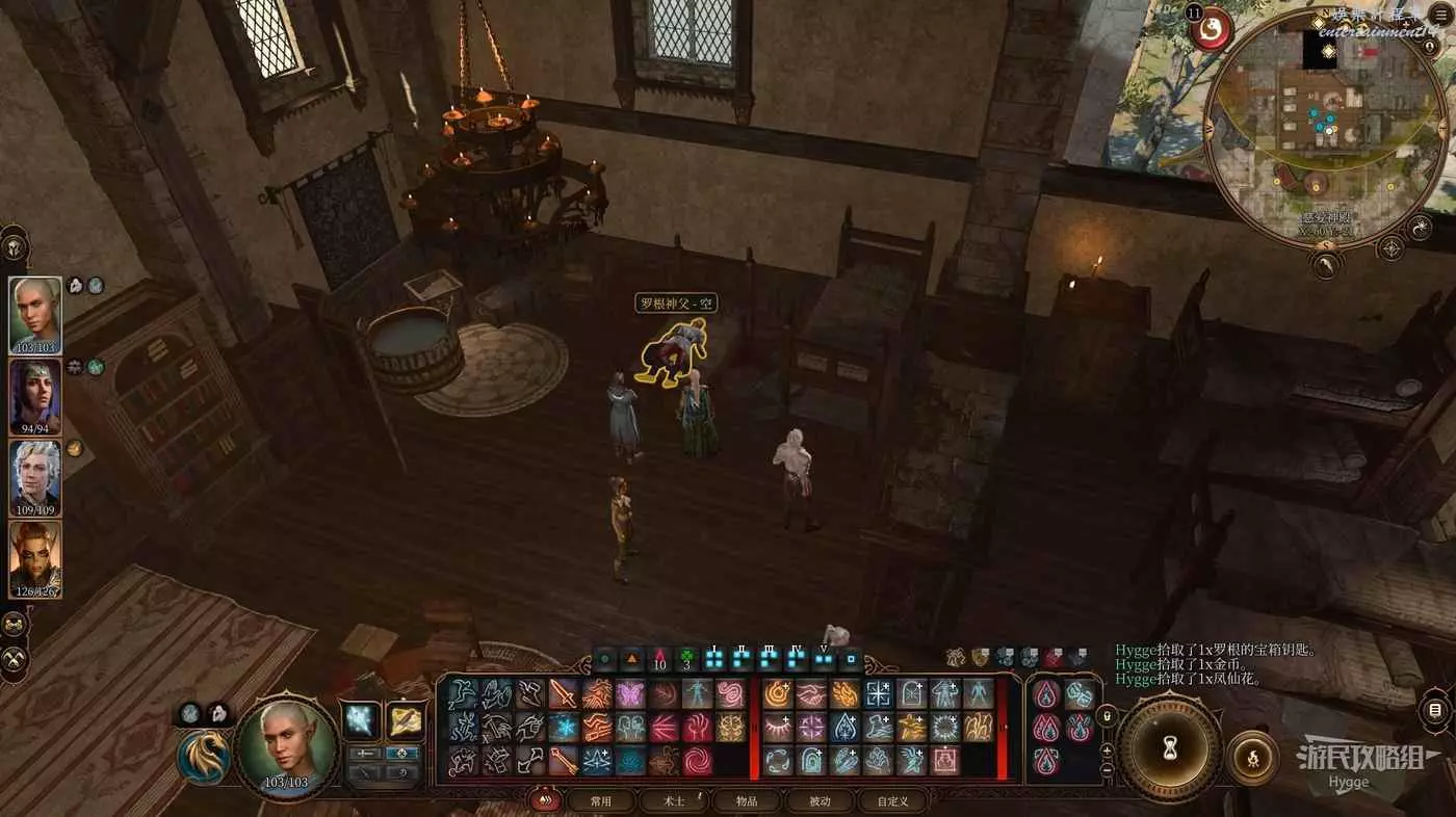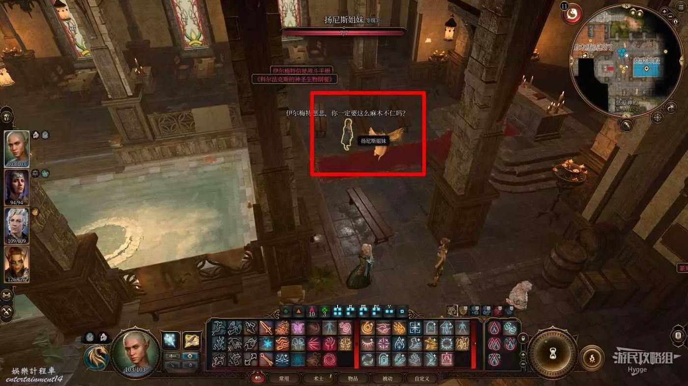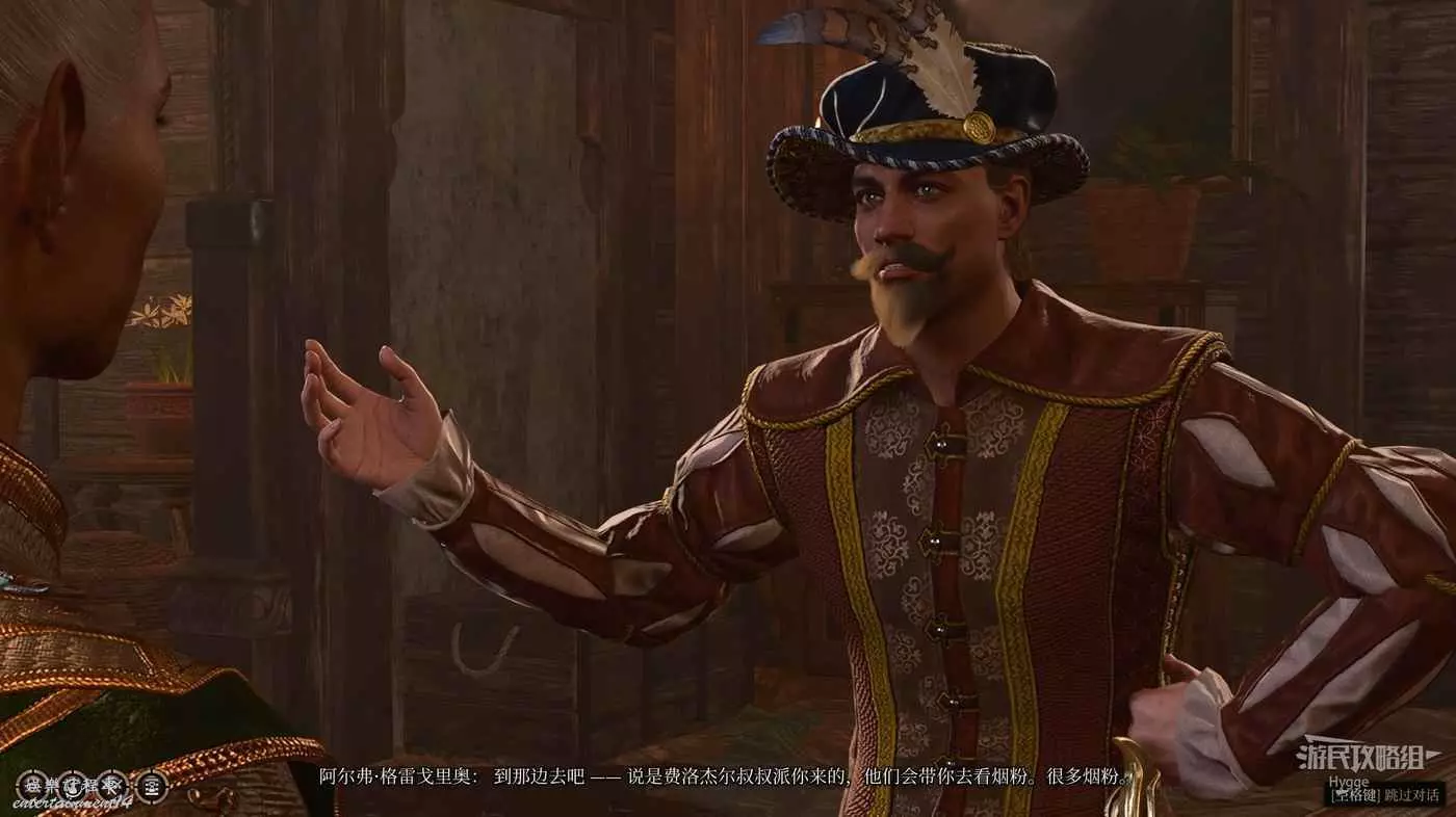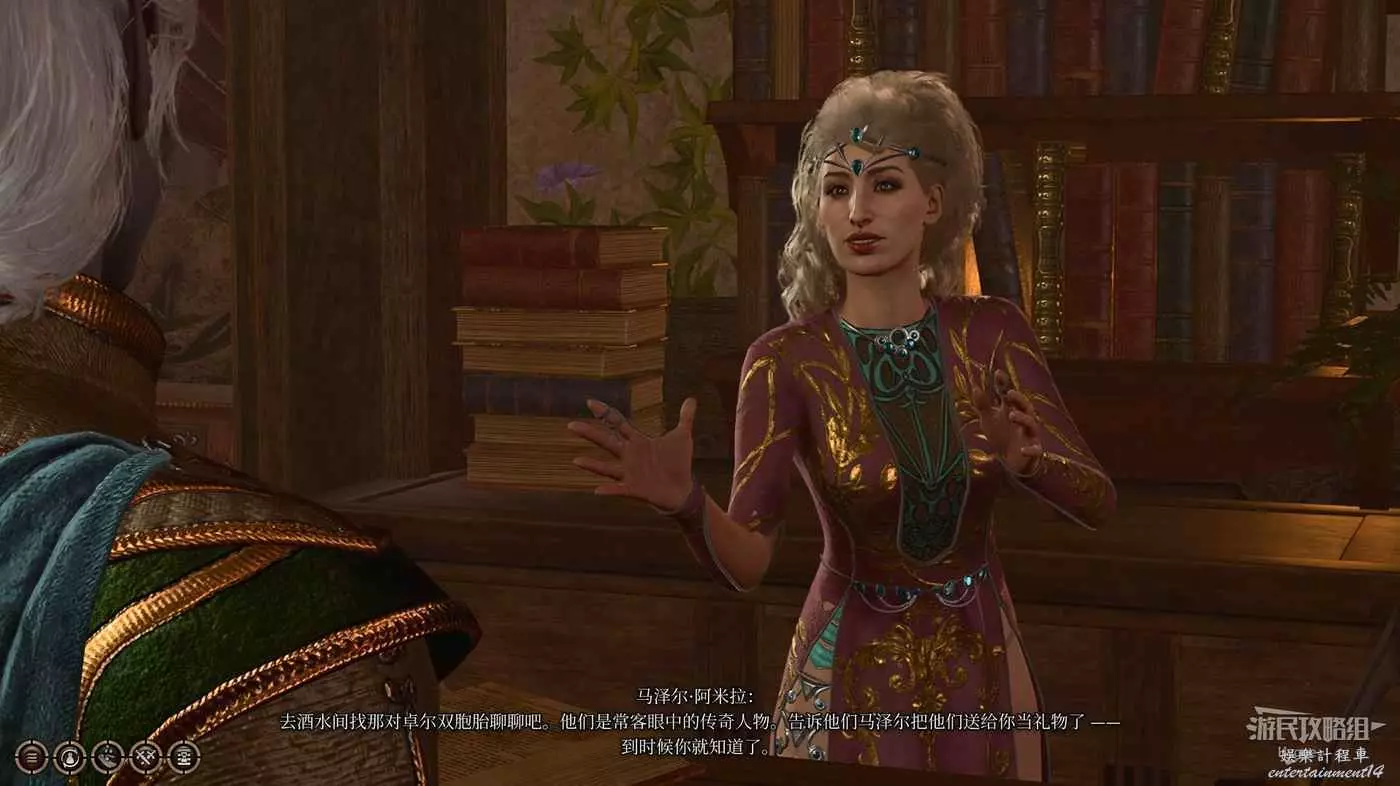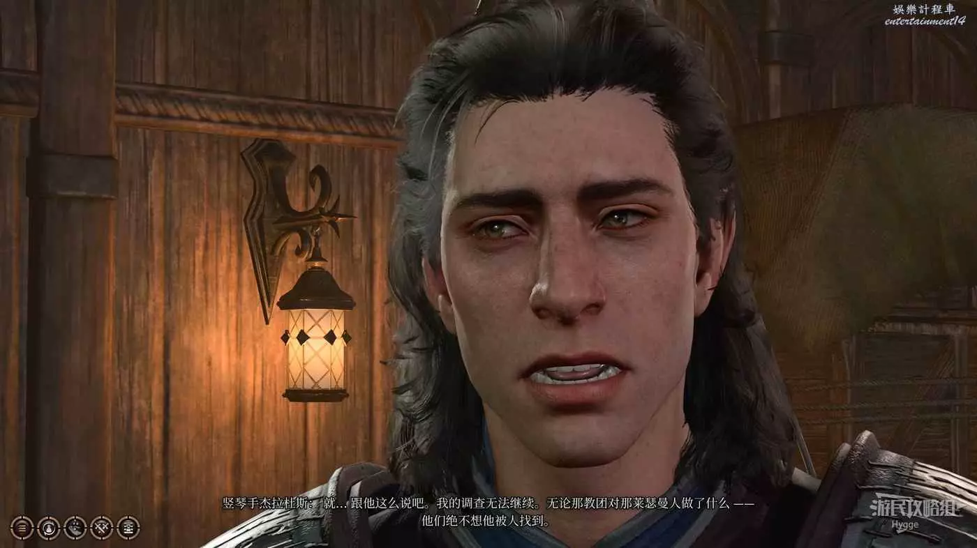 在地下室與豎琴手傑拉杜斯交談,通過洞察鑒定我們會發現他有一些害怕,鼓勵他說出真相後才發現此處除了他之外都是變形怪。