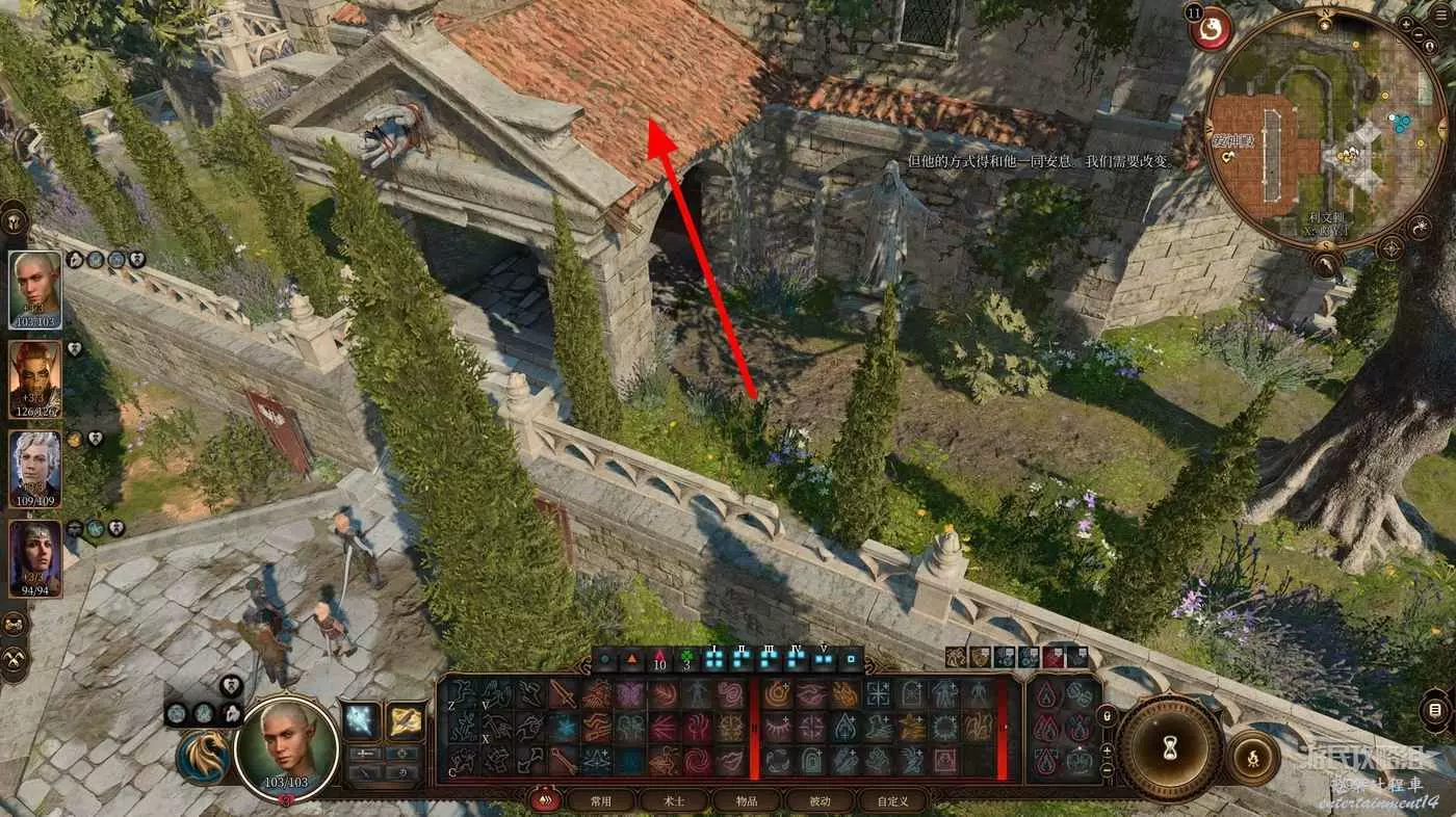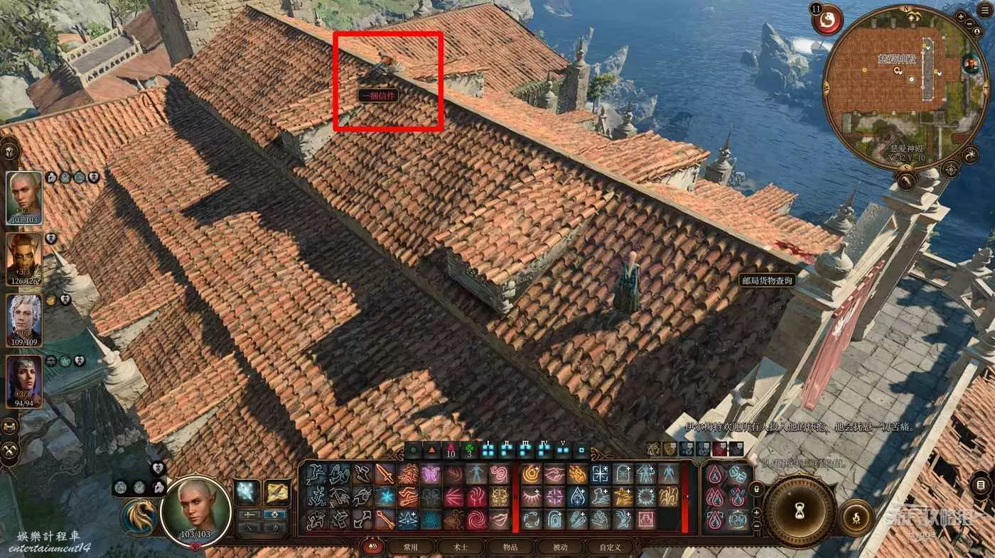 回到慈愛神殿正門後我們使用迷蹤步或者光榮一躍藥水等道具跳到神殿的屋頂上。